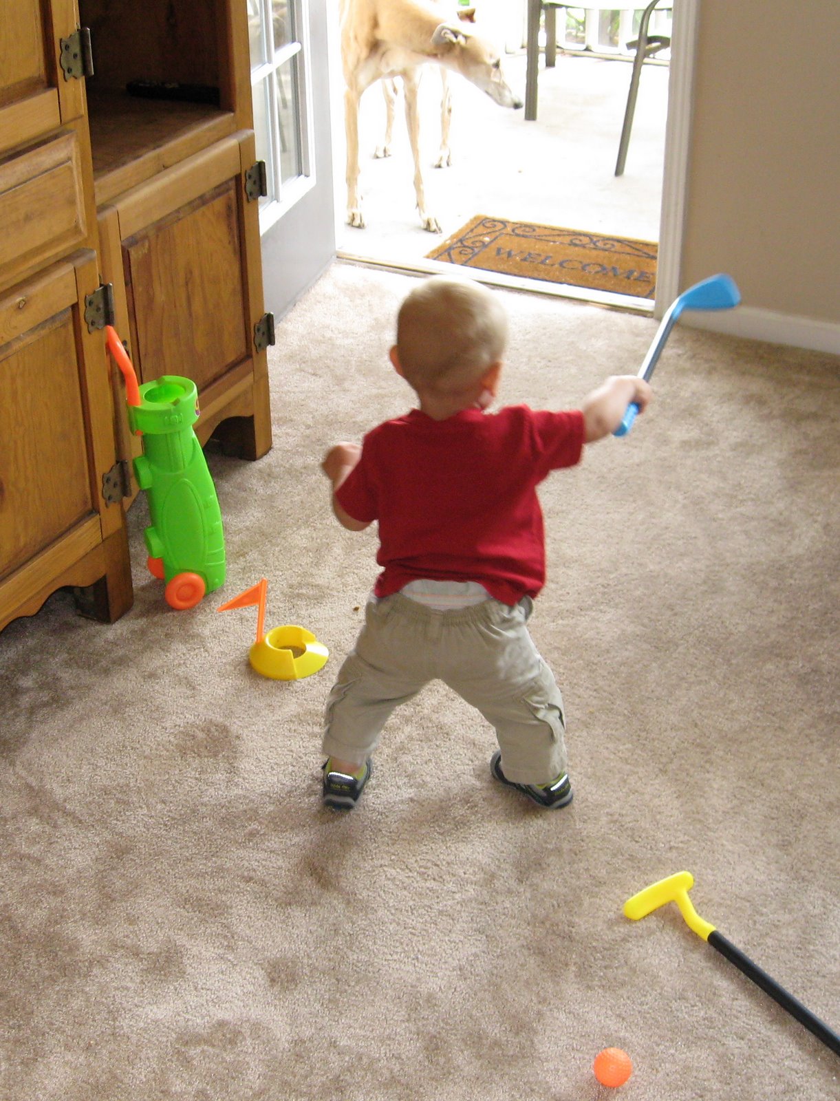 Andy purchased Davy his first set of Golf Clubs this weekend. Granted,the plastic set won’t allow him to hit the ball very far, not unlike his grandfather, but it will give him the opportunity to work on some fundamentals that all children learn, such as chasing the dog with the club, and wacking their mother and father in the shin with the club.