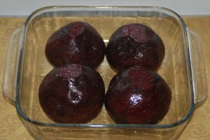 When we were in North Carolina, we stopped at Mitchell’s Farm to pick our own vegetables for a big vegetable soup.  While there the lady says, “Don’t forget to pick some beets…they are ripe and ready.”  Well, we didn’t pick any beets and I have been asking myself why ever since.  As a kid I didn’t like them, but then again what kid does?  As an adult I haven’t really found a vegetable/root that I don’t like so I decided it was time to give them another try.  These beets we bought out at the Farmer’s Market and they have been sitting in my refrigerator for a week.  I just couldn’t decide how I wanted to cook them, so I have been looking at recipes.  I love anything roasted…so here’s the one I chose off of Big Oven….