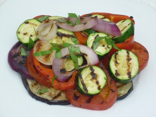 Heat a grill or a grill pan to medium high. Brush the vegetables with the olive oil on both sides and season with 1/2 teaspoon salt and pepper to taste. Grill the vegetables (in batches if necessary), turning, until soft and marked, about 6 minutes for the tomatoes, 7 to 8 minutes for the bell pepper, onion and zucchini, and about 10 minutes for the eggplant. Let cool.