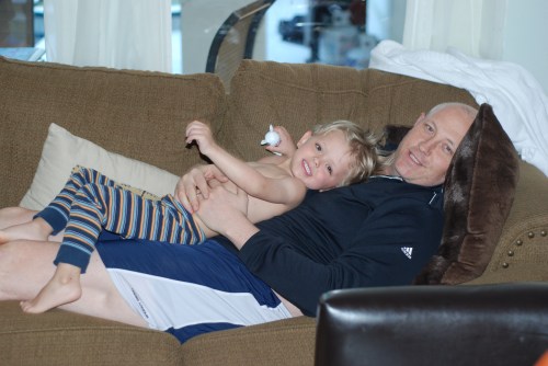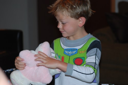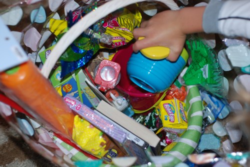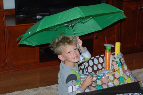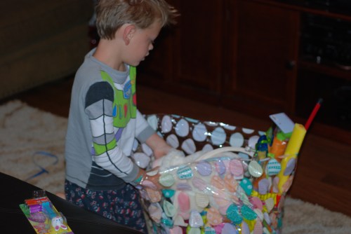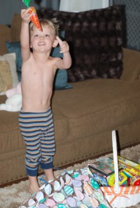 So, it is bright and early Easter morning and Andy comes in the bedroom to wake me up….”They are up and in the man room, I can hear them.” Sure enough, there they were standing in the man room, in the dark, holding one of the Easter baskets that they bunny had hidden in the house. They were so excited. It took Davy a while to find his, but eventually he did in our bath tub. We brought both baskets into the living room and let them dive in….
