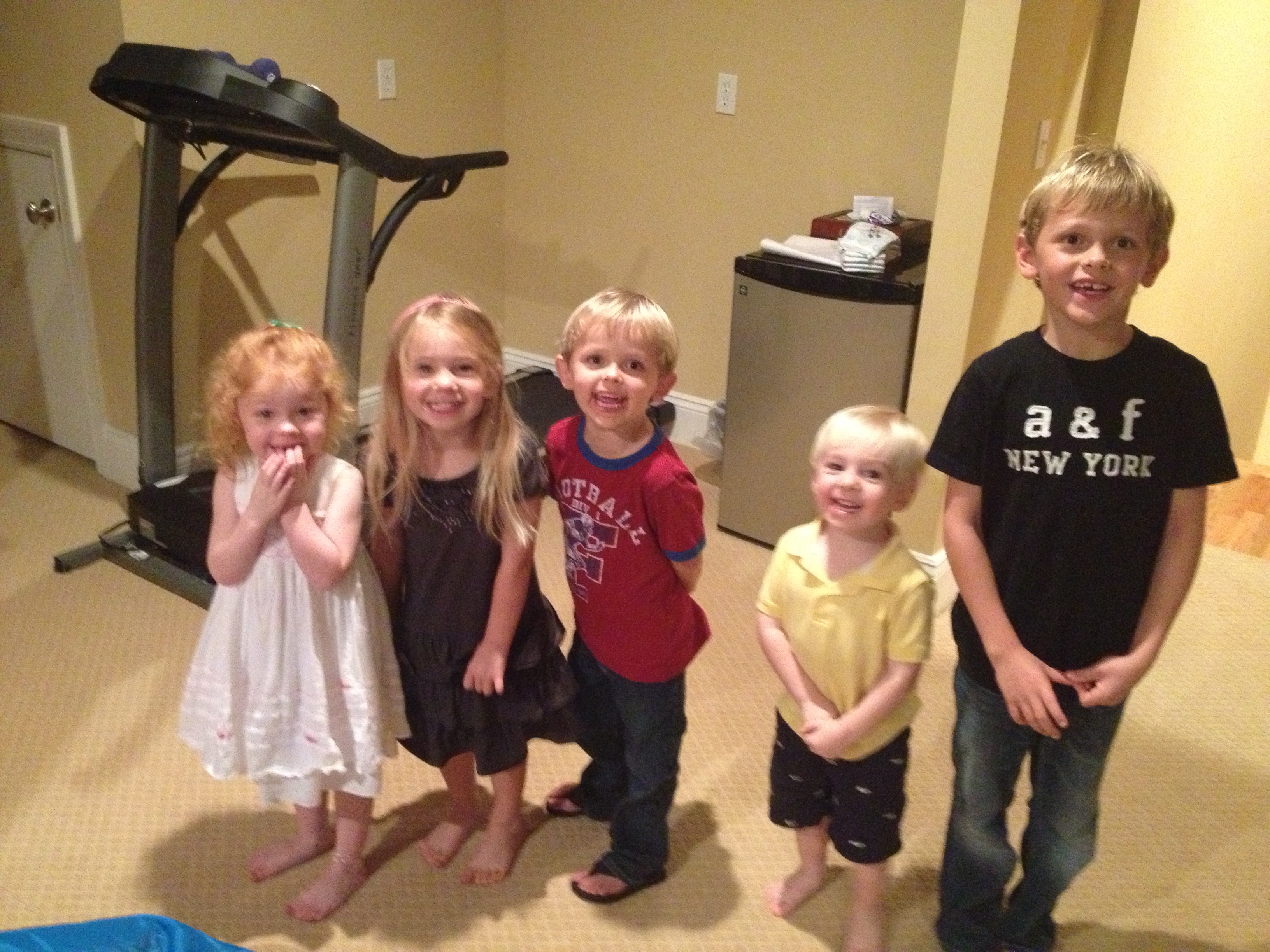 After the first week back at school, all of us slept in a little later this morning. At noon, Mark picked up Andy and Matty and they headed over to Lad’s to watch the Indiana basketball game, while Davy and I had a little one on one time ourselves. I needed to run a few errands so we headed to south Tampa and made our first stop GiGi’s Cupcakes. He squealed and immediately picked out the one with the pink icing and sprinkles (Birthday Surprise)….hmm, very similar to his donut selection :)…and then he picked out a chocolate one (chocolate chip cookie dough). We split them in half and shared, they were melt in your mouth delicious. We all met back at the house at 3:30 and then left at 4:30 to head over to a dinner party at the Wilson’s home on Davis Islands. There were five families there and we had a wonderful time. Here are Avery, Adley, Matty, Bryce, and Davy waiting for the bounce house to be blown up…