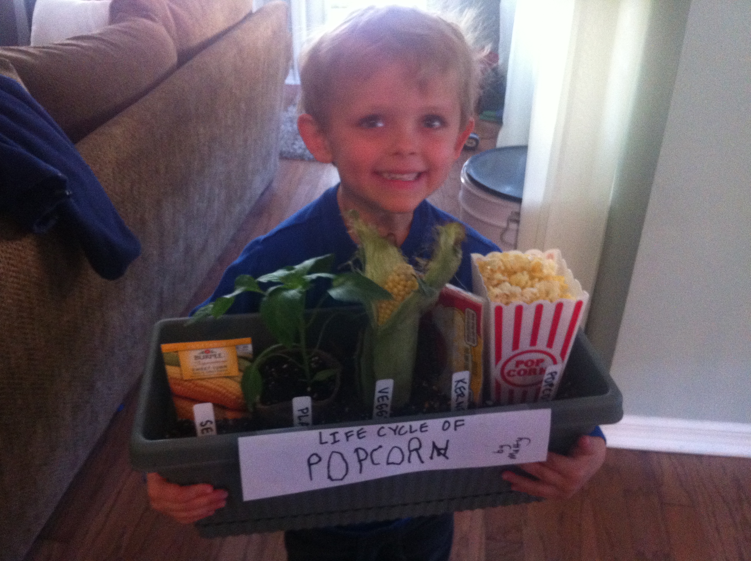 All this month Matty’s class is focusing on different life cycles. Each child had to do a project at home and then bring it in for show and tell. This year Matty decided to do the life cycle of popcorn. He had the seeds, plant, ear of corn, package of unpopped popcorn, and a tub of finished fresh popped popcorn.