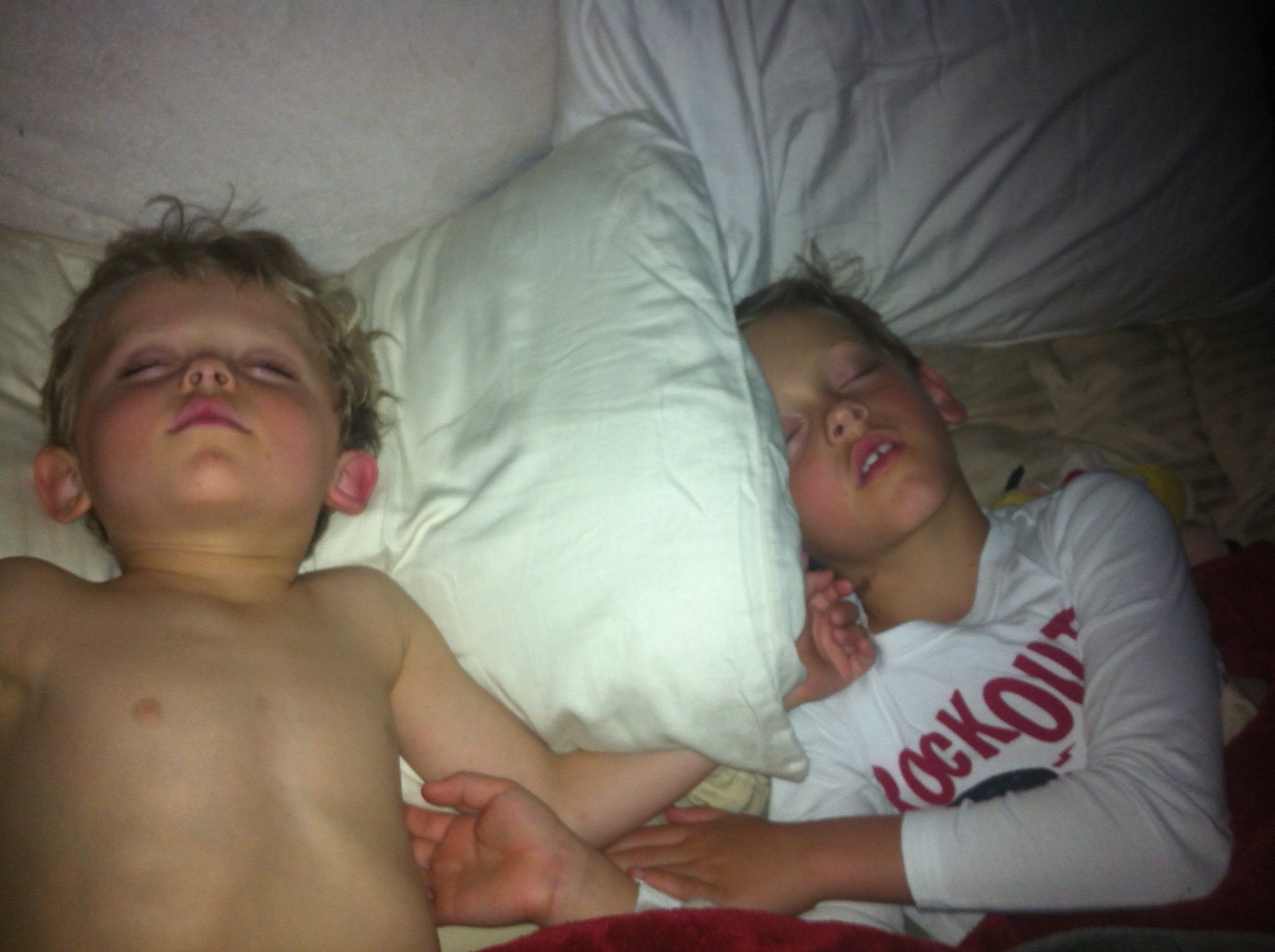 This is what happens when Andy travels….I end up with two blonde monkeys in my bed! 🙂
