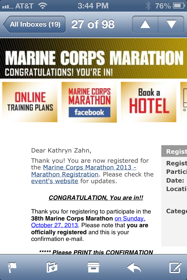 After months and months of waiting and counting down….today is registration day for the Marine Corps Marathon! At 12 noon registration went live and over 100,000 people crashed onto their site hoping for one of 30,000 spots. After many website errors, host crashing, and page timeouts around 1:30pm I received confirmation and just before 2pm Kelly did. Whew…. The entire marathon closed in 2 hours and 27 mins. We are so excited to have the two spots and can’t wait to participate in the 3rd largest Marathon in the US and 8th in the World!