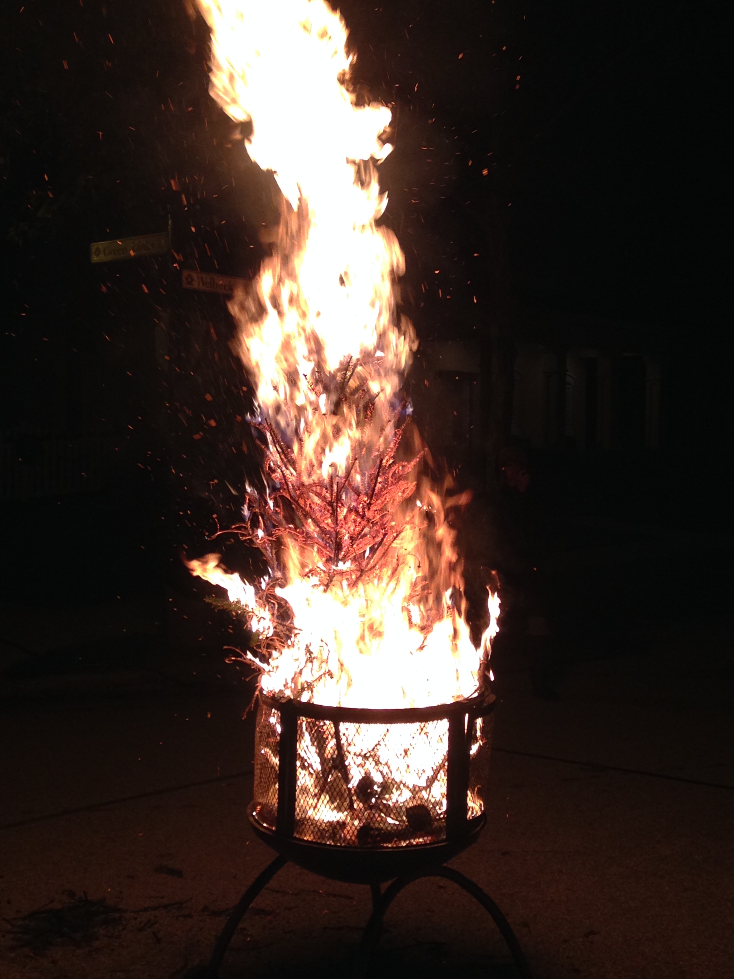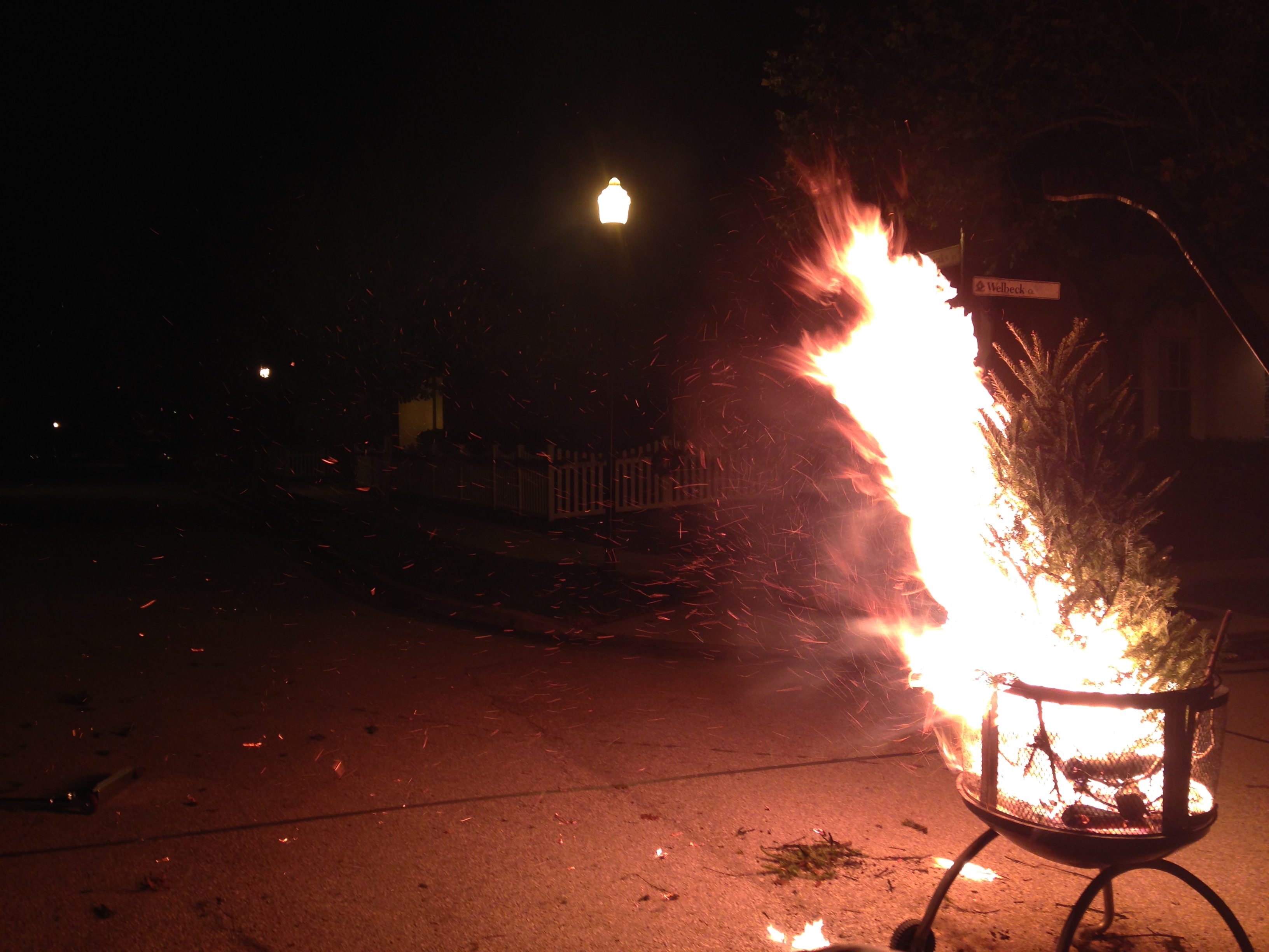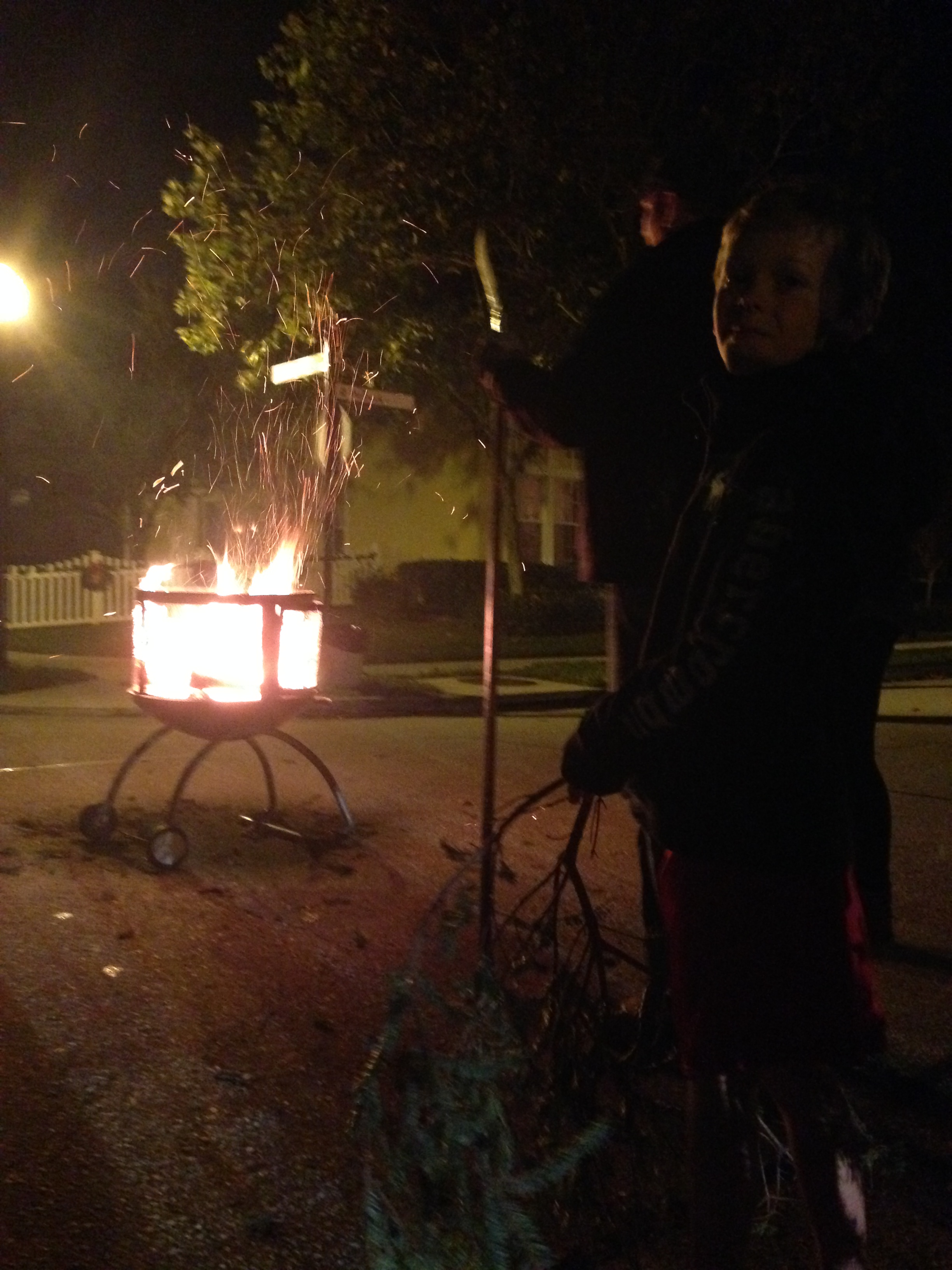 Every year The Village Green, our neighborhood, has a Christmas tree burning party. We place the trees on the curb and the kids of the neighborhood haul out their wagons to go collecting. This year we had 42 trees!