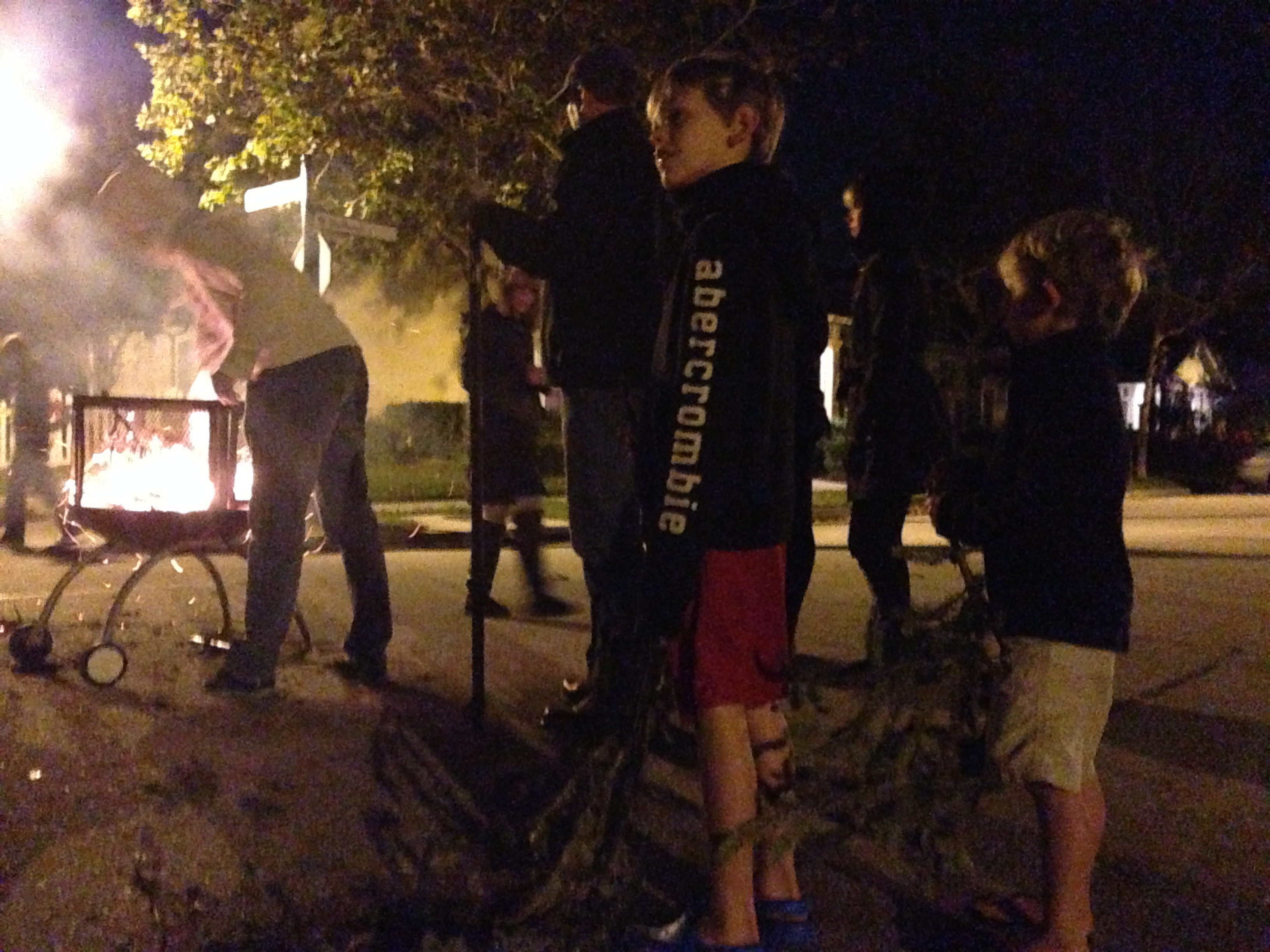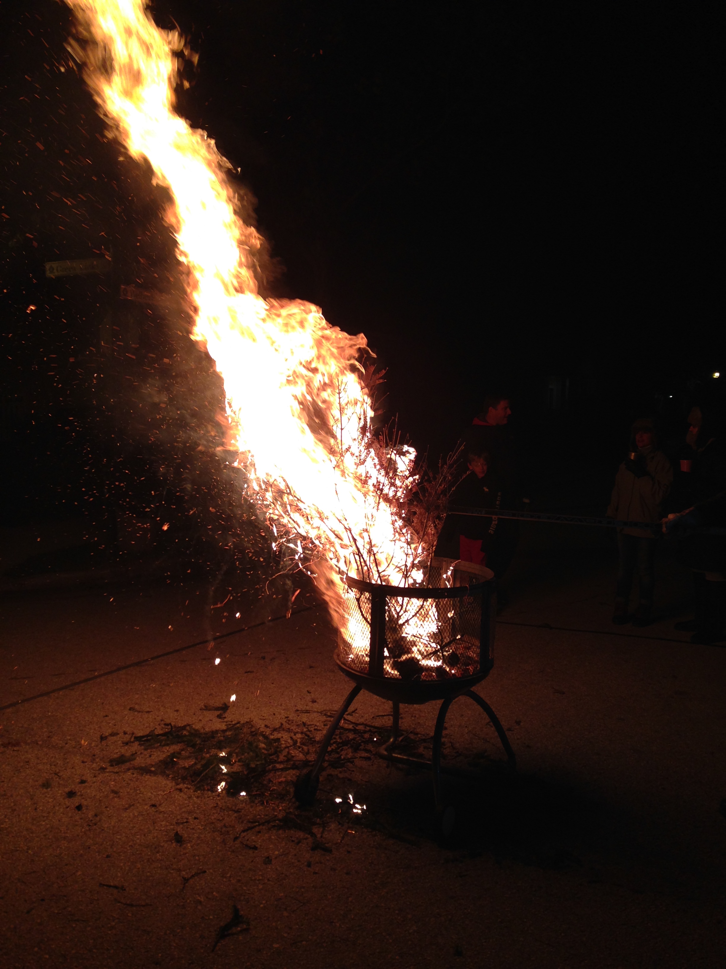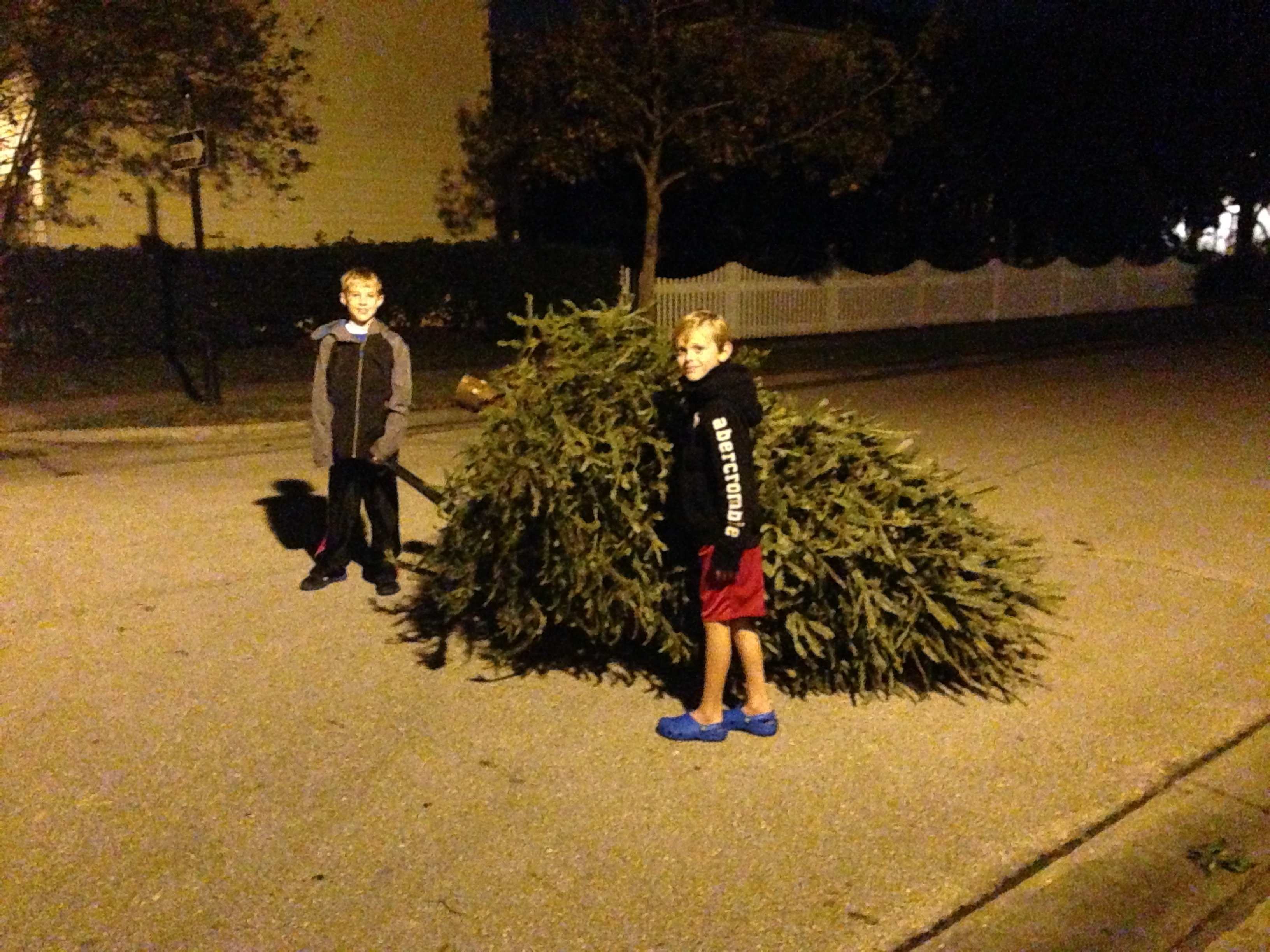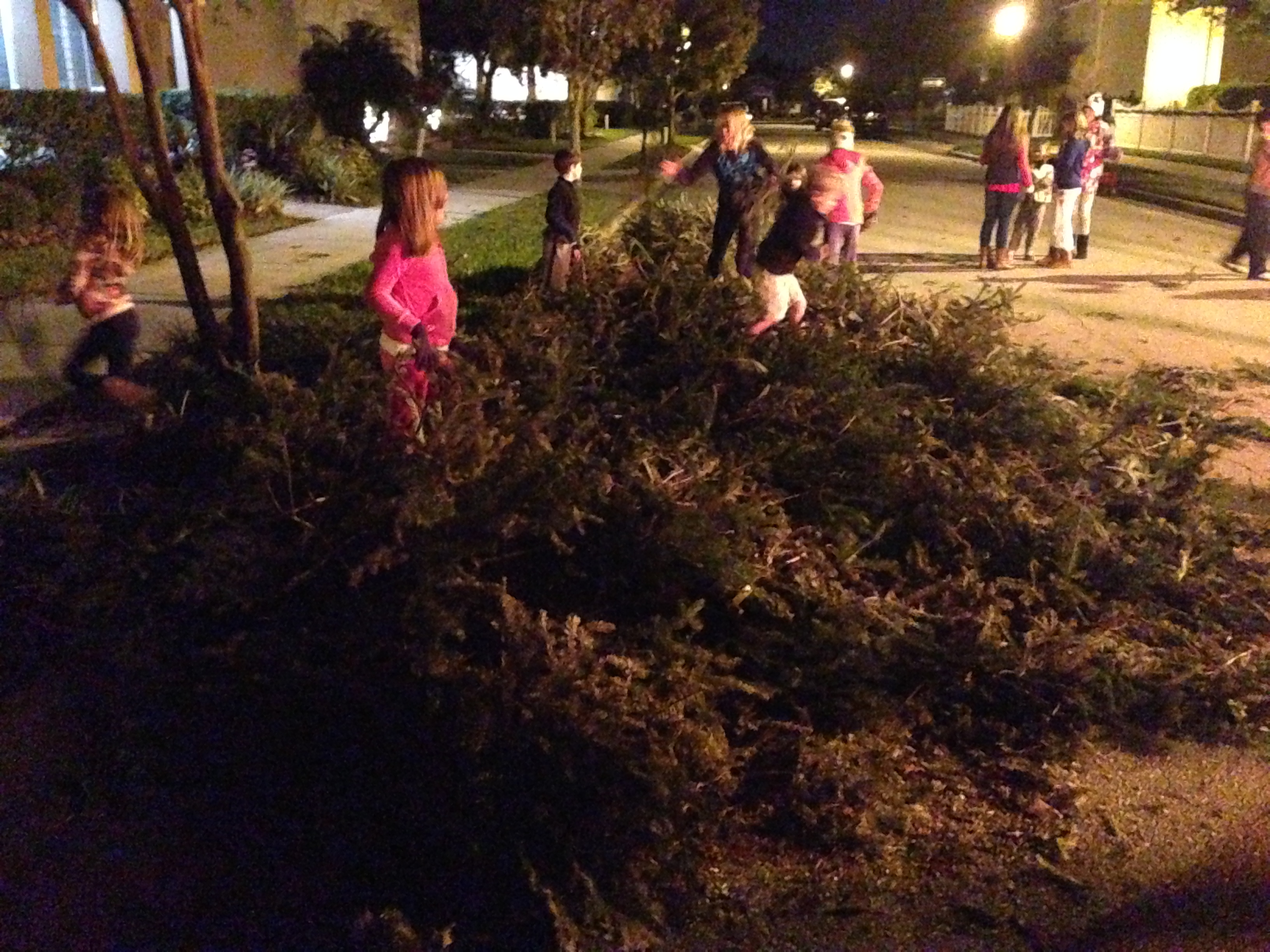 Every year The Village Green, our neighborhood, has a Christmas tree burning party. We place the trees on the curb and the kids of the neighborhood haul out their wagons to go collecting. This year we had 42 trees!