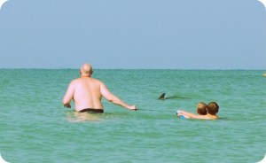 Our bedrooms are on the east side of the house and at 6:51 am I hear, “Mommy, it’s morning…can we go to the beach now?” Gotta love little Matty bear. Of course my answer was, “Matty, mommy is sleeping…not yet and go away.” 🙂 At 8am we fixed breakfast and at 9am we headed to the beach. The weather was beautiful and the water was calm. Paradise. Immediately after we set up the beach chairs and toys Colin says, “Look mom a dolphin!” We grab our cameras and start scanning the horizon. Sure enough there was a dolphin family, including a little baby dolphin. The kids loved chasing after them in the water and it was so fun to watch their faces as they all got to swim with the dolphins.