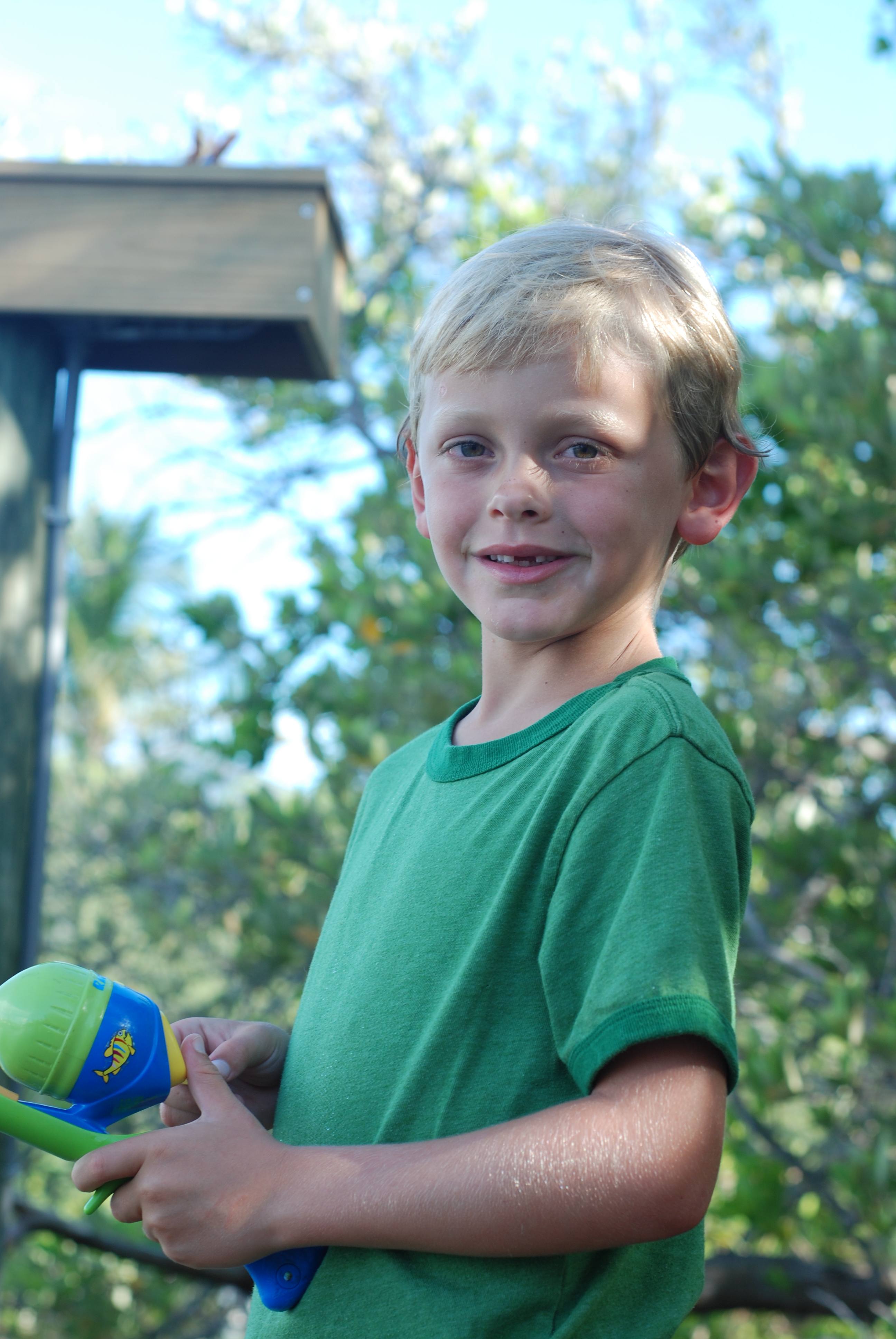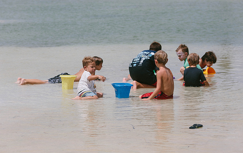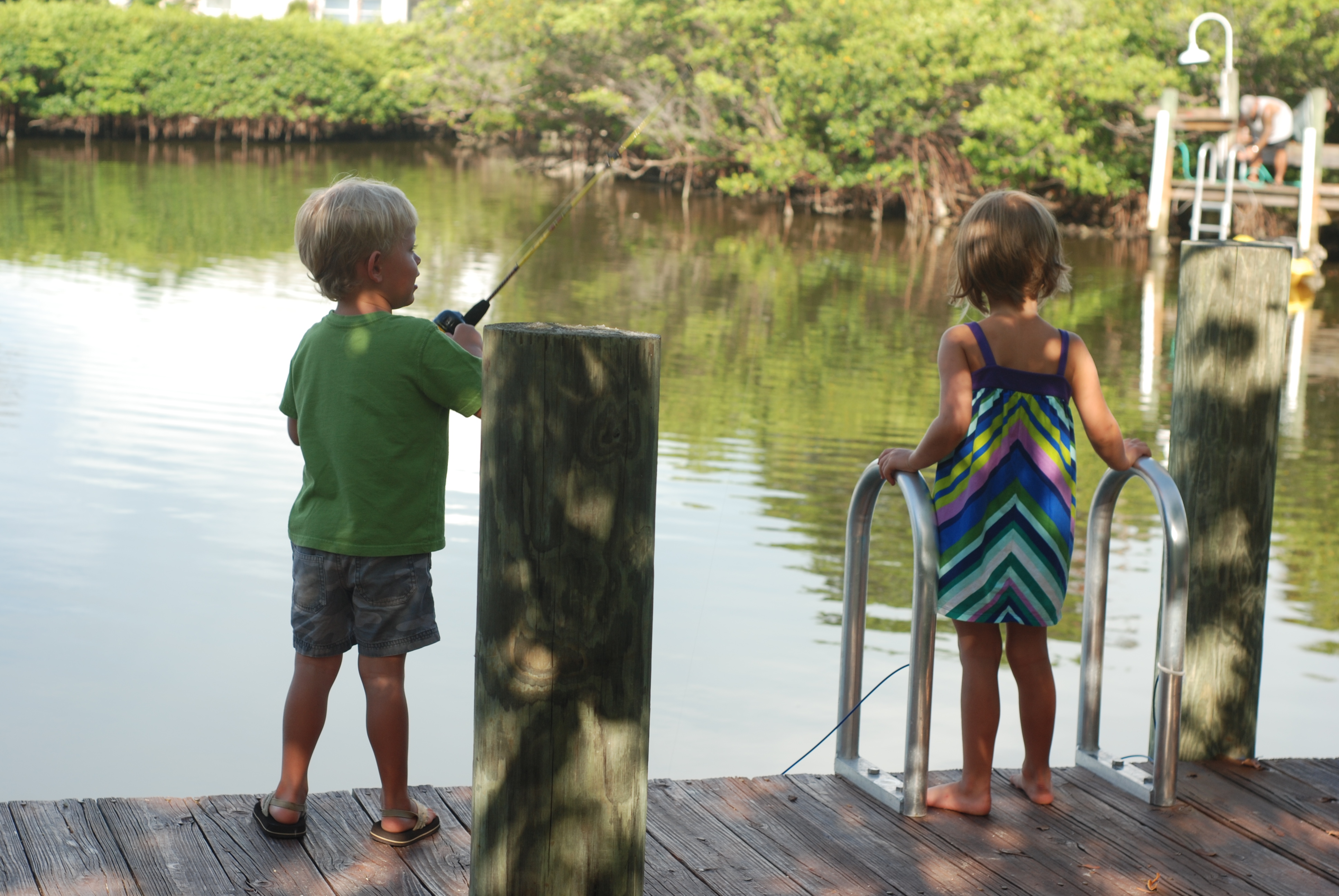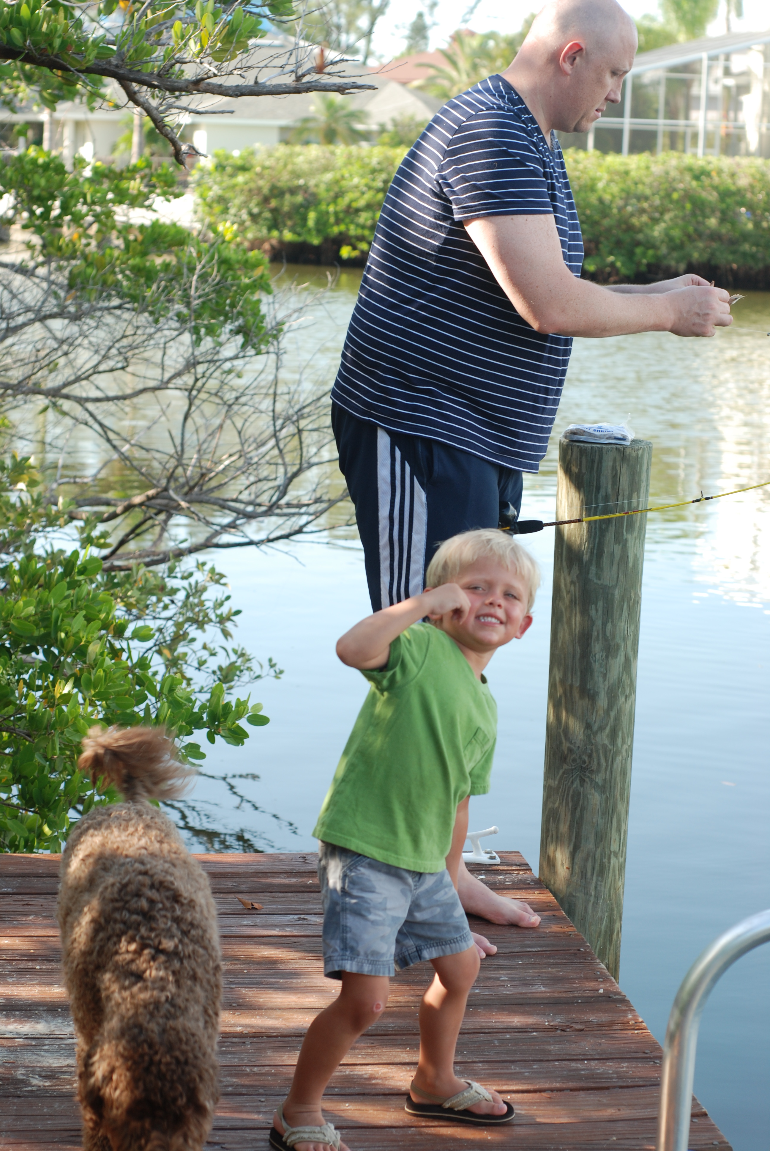It is the end of our first week at the beach and we have two more to go. We were on the dock behind the house fishing into the canal. I had my camera with me so that I could get some great shots of the boys. I stepped around Davy towards the end so that I could get a picture of all three of them in my frame and that’s when Davy flung his fishing pole backwards to cast it in. I however was not paying attention and proceeded to step back out-of-the-way and stepped right off of the dock. In my mind everything slowed down as I was having the realization of “oh crud, I’m going into the canal and am going to get wet”, so I threw the camera up onto the dock so it wouldn’t get ruined. The drop was roughly 6 feet and you would think that the water would be deep, but it wasn’t. It was probably 1 1/2-2 ft deep. I landed on my left foot, heard my knee pop, and then curled up into the fetal position as I wanted to drown from the pain.
