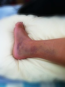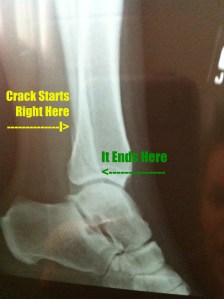 I ended up breaking the fibula straight across, with another slight crack above it. You’ll see on the x-ray that only the top of the crack displaced so we didn’t need to put a pin in…thank goodness. Once we got to the ortho and he reviewed the films, he found another fissure crack on the inner ankle bone. After being wrapped up, the Ortho decides on a walking boot. I am so glad for many reasons, but the obvious were that 1. I could shower and 2. My foot swelled so bad (I swear it was the size of a football) that I kept having to loosen it. A hard cast wouldn’t have allowed that.