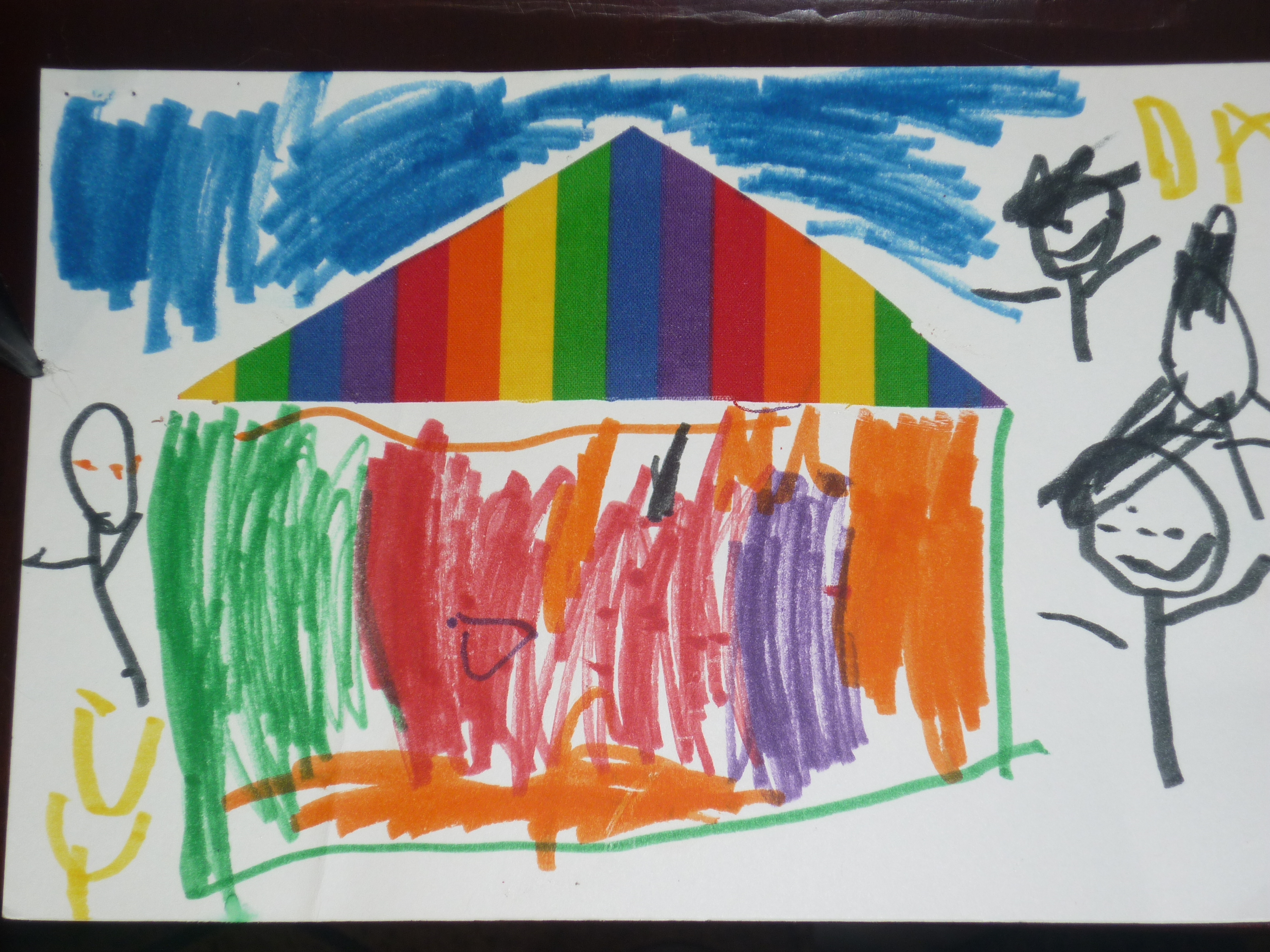Now, of course my eyes whelled up with pride that he made a picture about his family…so I had to add it to their blog. Andy and I had a quick joke between the two of us wondering who was the person on the left with the glaring orange eyes, until we asked Davy and he said, “That’s you Daddy!” When we asked why they were orange he simply stated, “Because I like orange.” If we had looked a little closer we also would have noticed that Andy was the only one who didn’t have any hair. How cute it that! So, Andy asks Davy why he was on the left side by himself and Davy’s response was, “Well Daddy, you can just walk on over!”