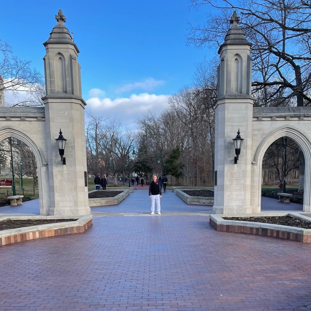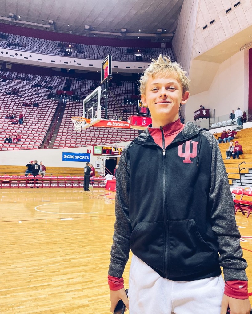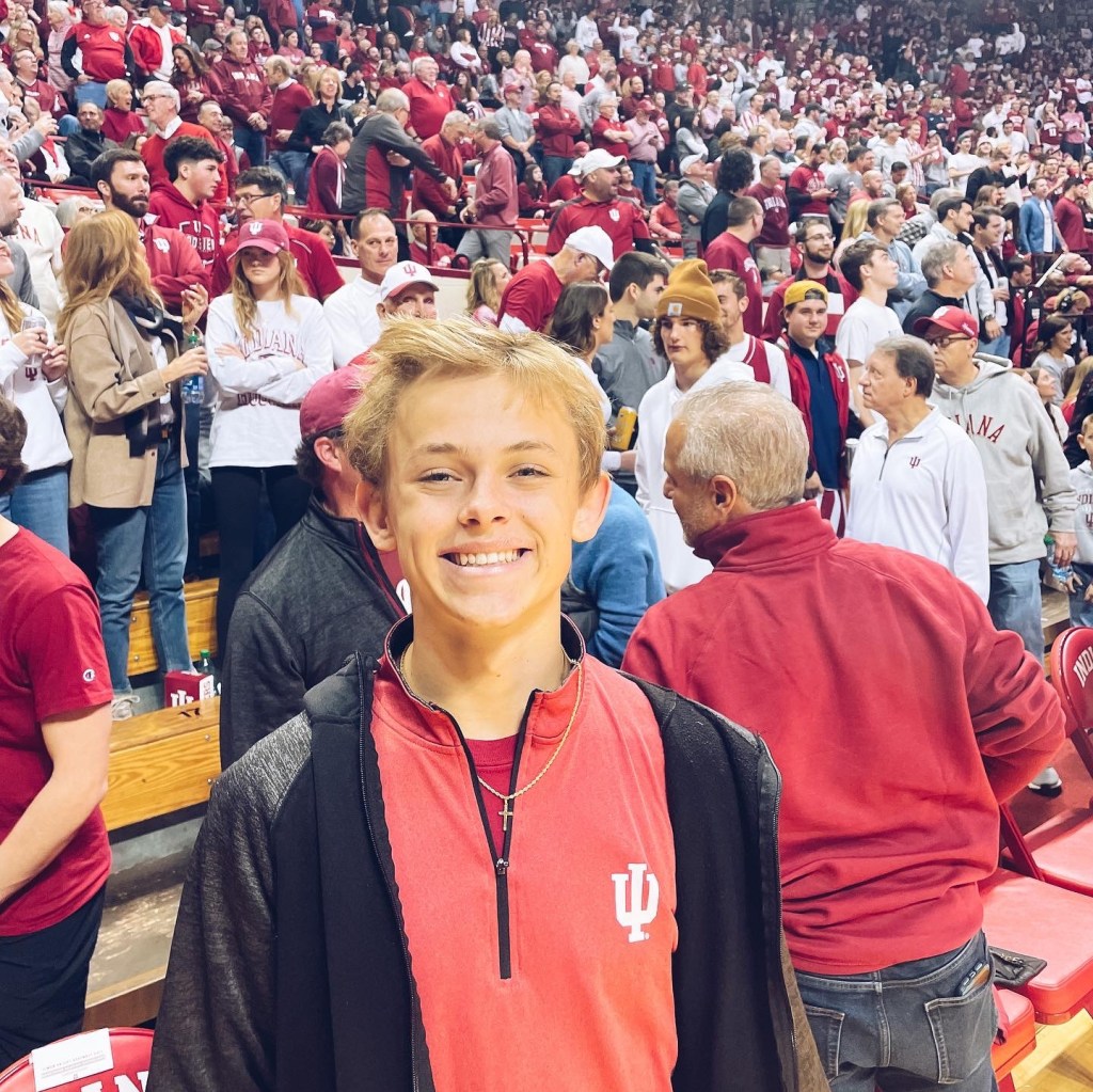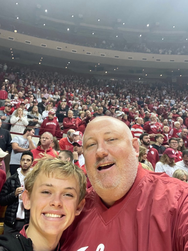 Andy and Matty sitting courtside at the basketball game. Hoosiers won!