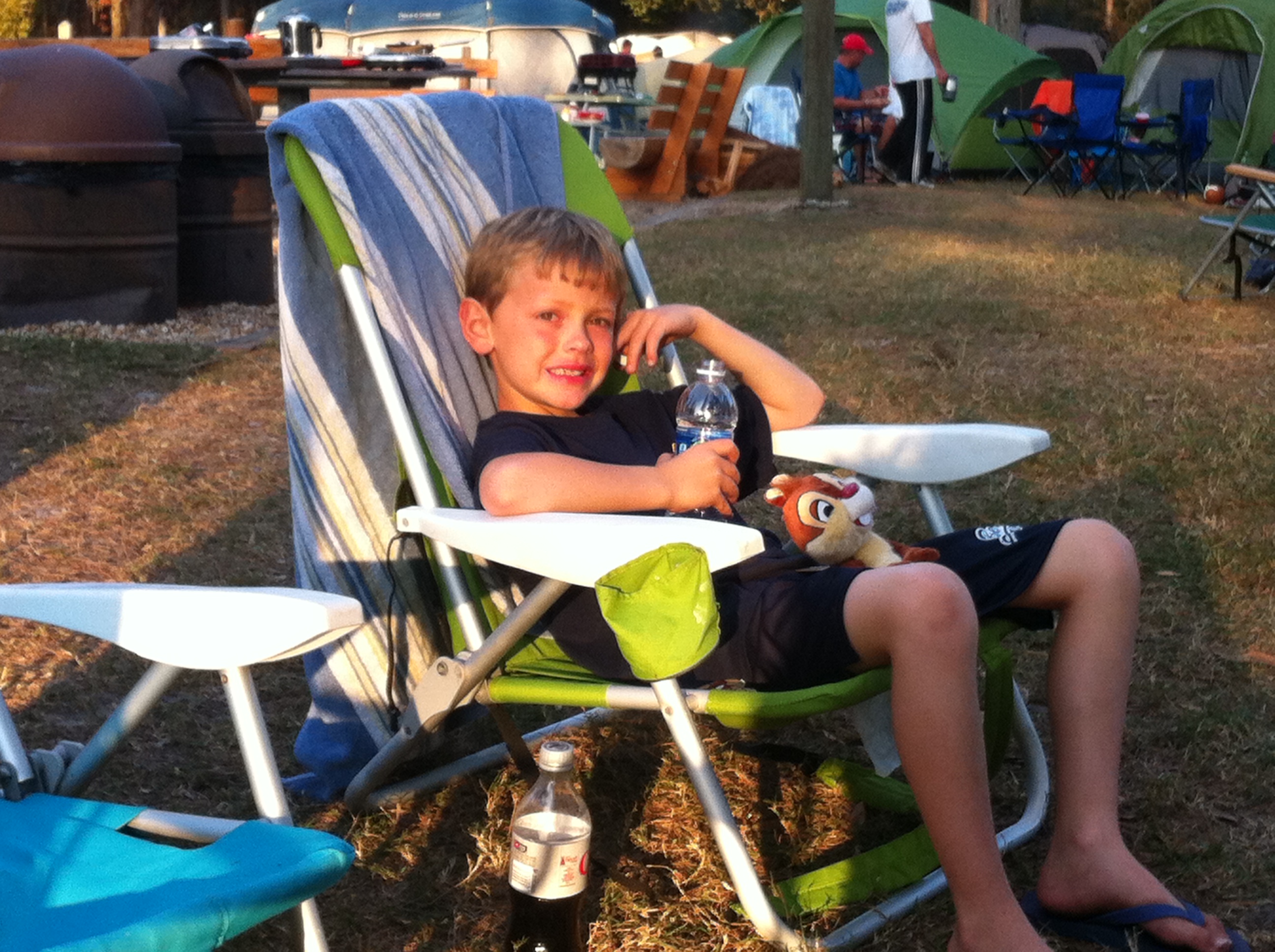 This tent that we were using was a 4-6 man tent. It wasn’t large, but it wasn’t too small either. It was 55 degrees, almost a little to chilly, so we each wore our pullover jackets and snuggled down under the blankets. It was Andy, me, Matty, and Davy. At 12:45, Matty sits up and starts projectile vomiting across this little tent. All over himself, me, the blankets, his stuffed animals, pillows, just everything. Instantly, we all wake up and move out-of-the-way. So gross. To top it all off we are in the middle of 100 other tents and it is soooo quiet out. So, as the stench takes over, I start pushing Andy to get out of the tent and get some towels to help me clean this up. He opens the tent and trips trying to get out ripping the whole bottom of the tent so now it won’t close. He stumbles into one of our beach chairs to catch himself and breaks the chair. Oh my…