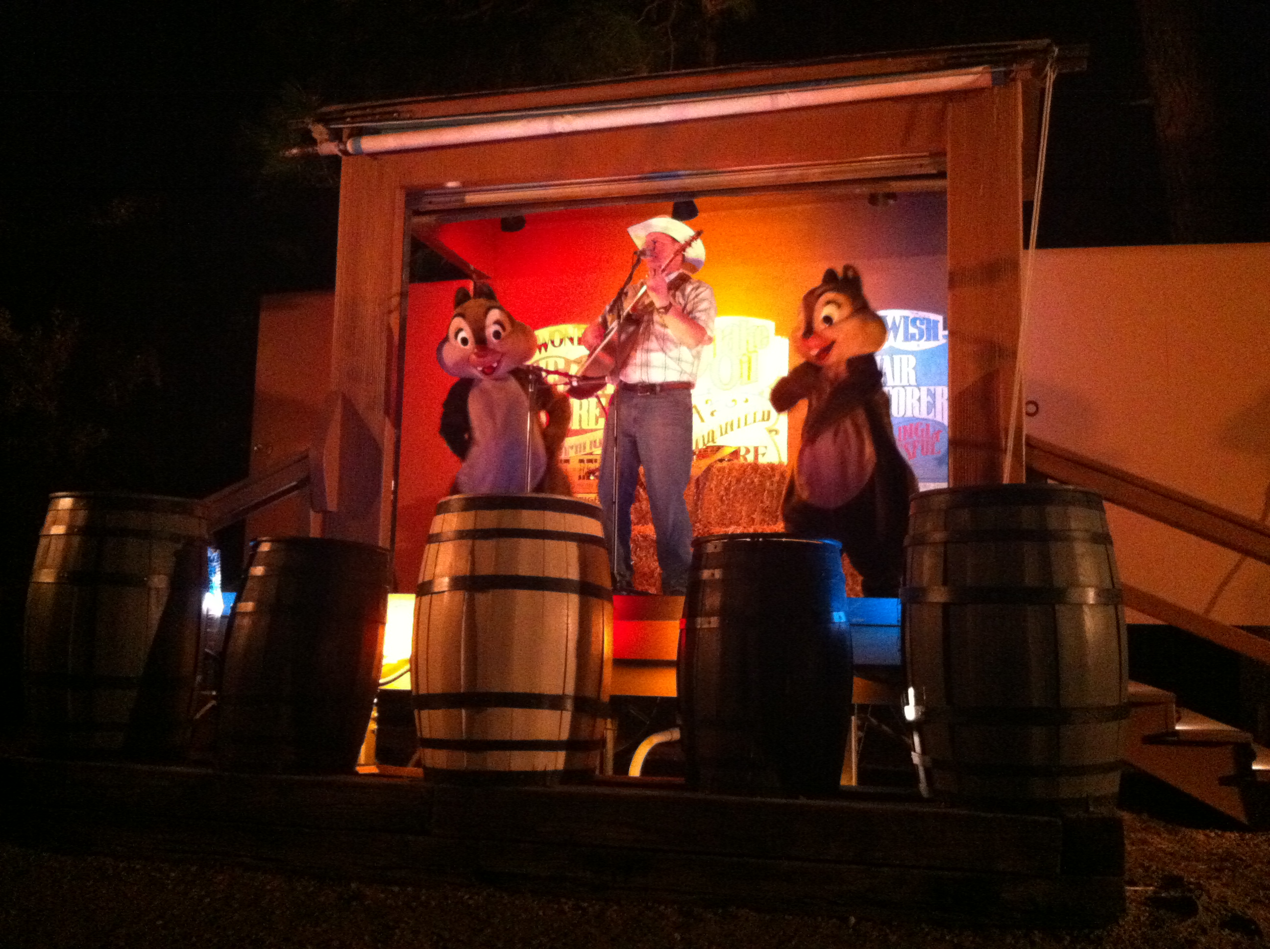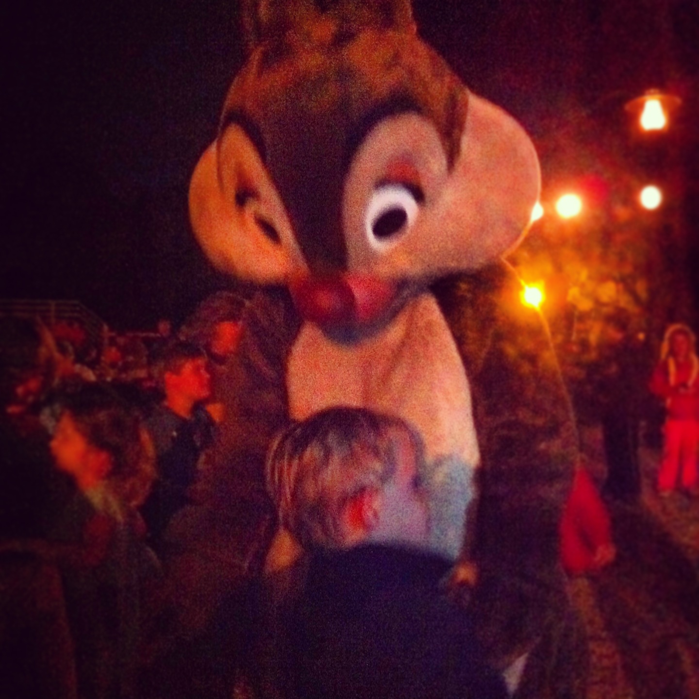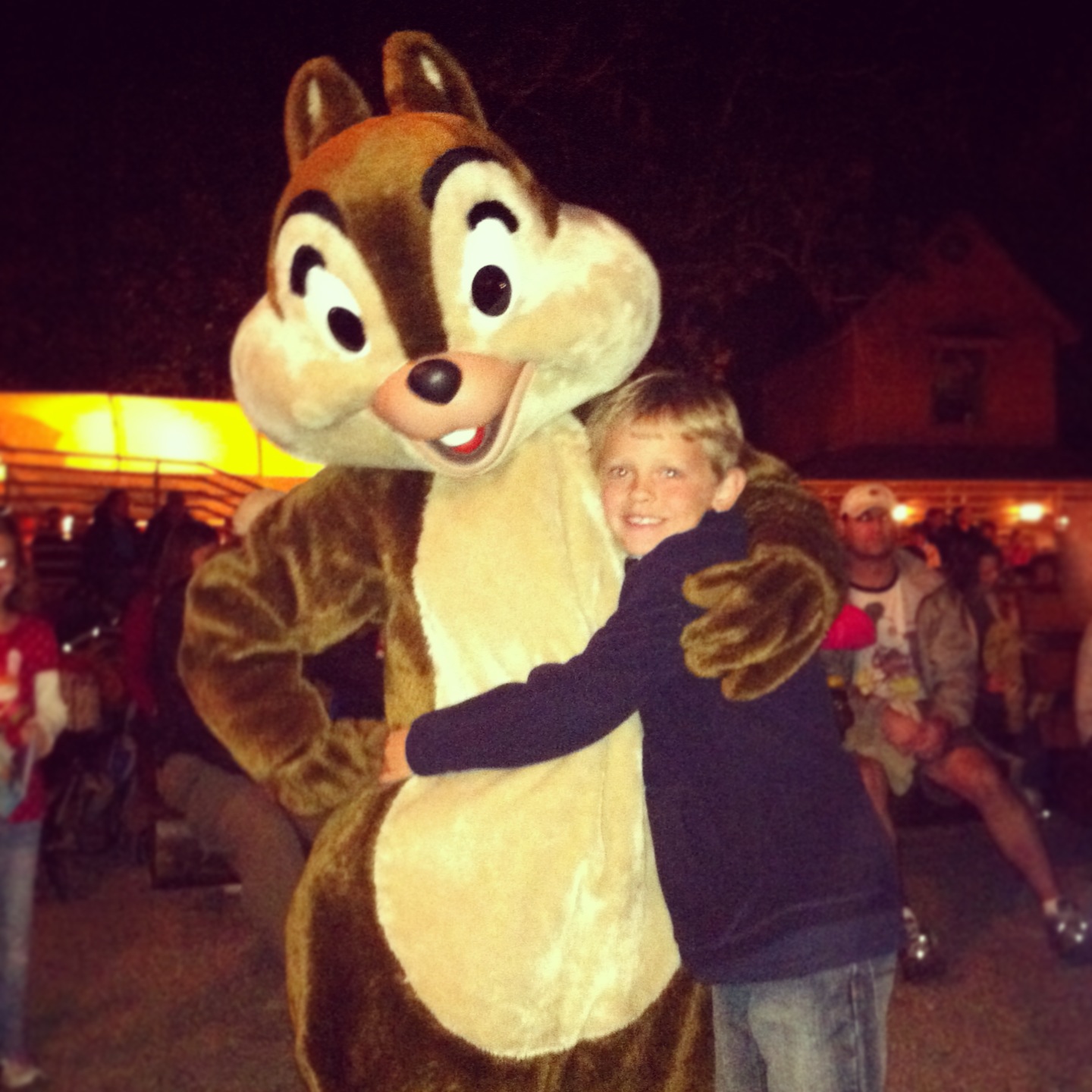 After dinner we headed over to Chip and Dales Campout. The boys got to meet Chip and Dale, sing-a-long with the show and afterwards watch Toy Story 2, the movie under the stars. Right before it ended we walked back down to the marina to get ready to watch the fireworks. An employee told us to take the dirt path to the right and wander down until the opening that the view of the fireworks was much better than from the dock, and he was right. We had a perfect, clear view of them. I loved this moment. We took the purple bus back to the camp ground and called it a night around 10:30. It was a perfect family day. 🙂