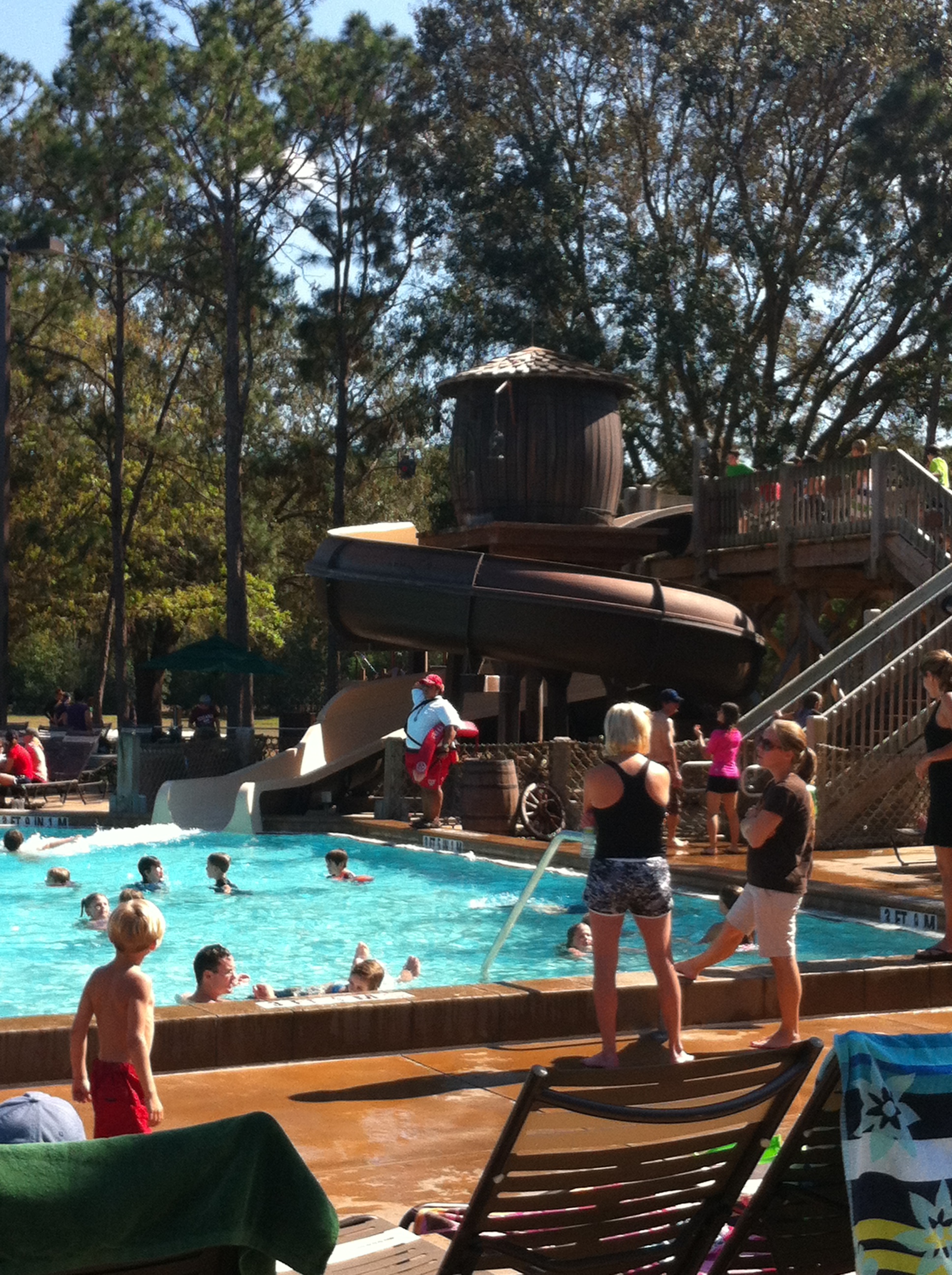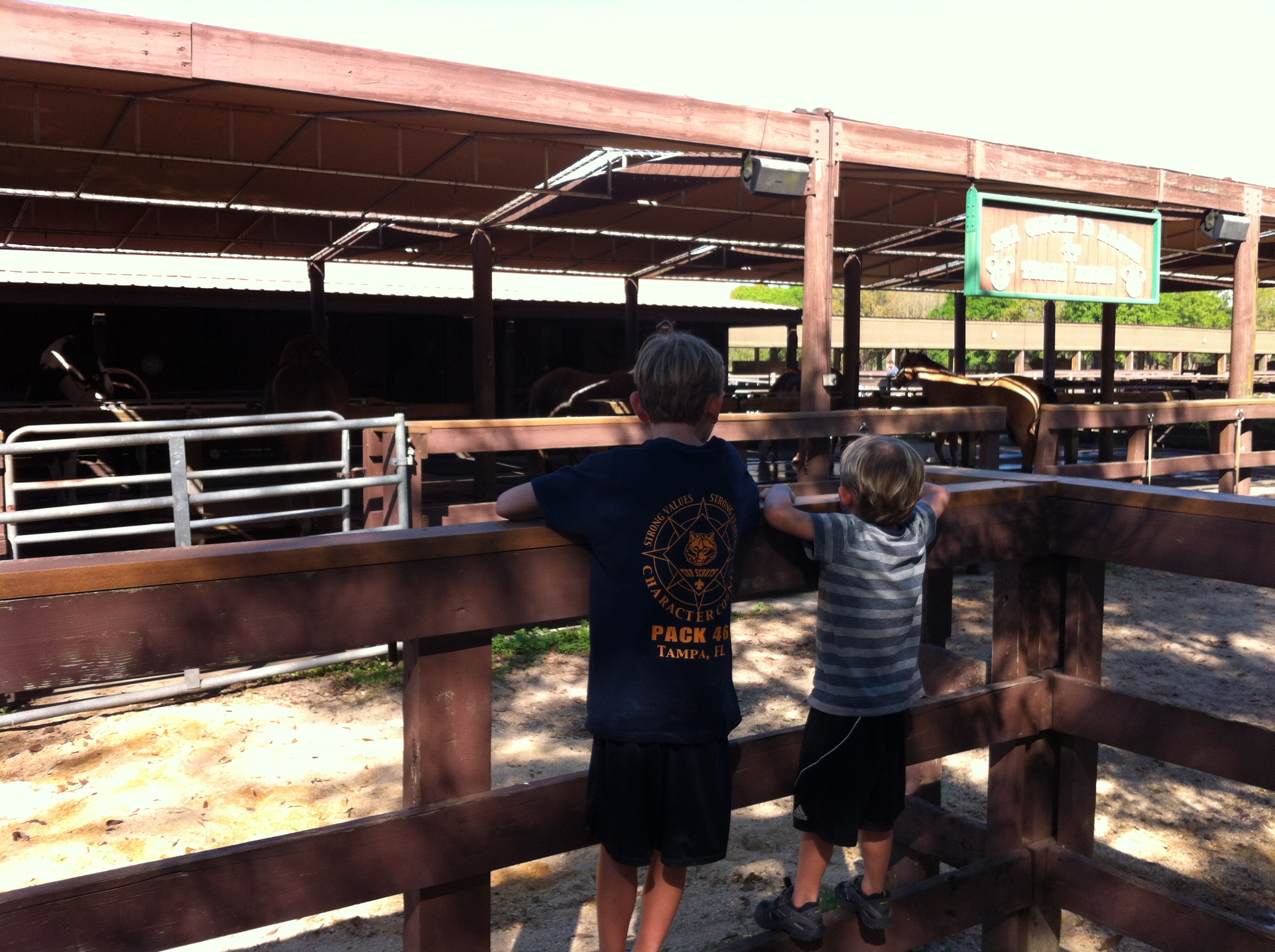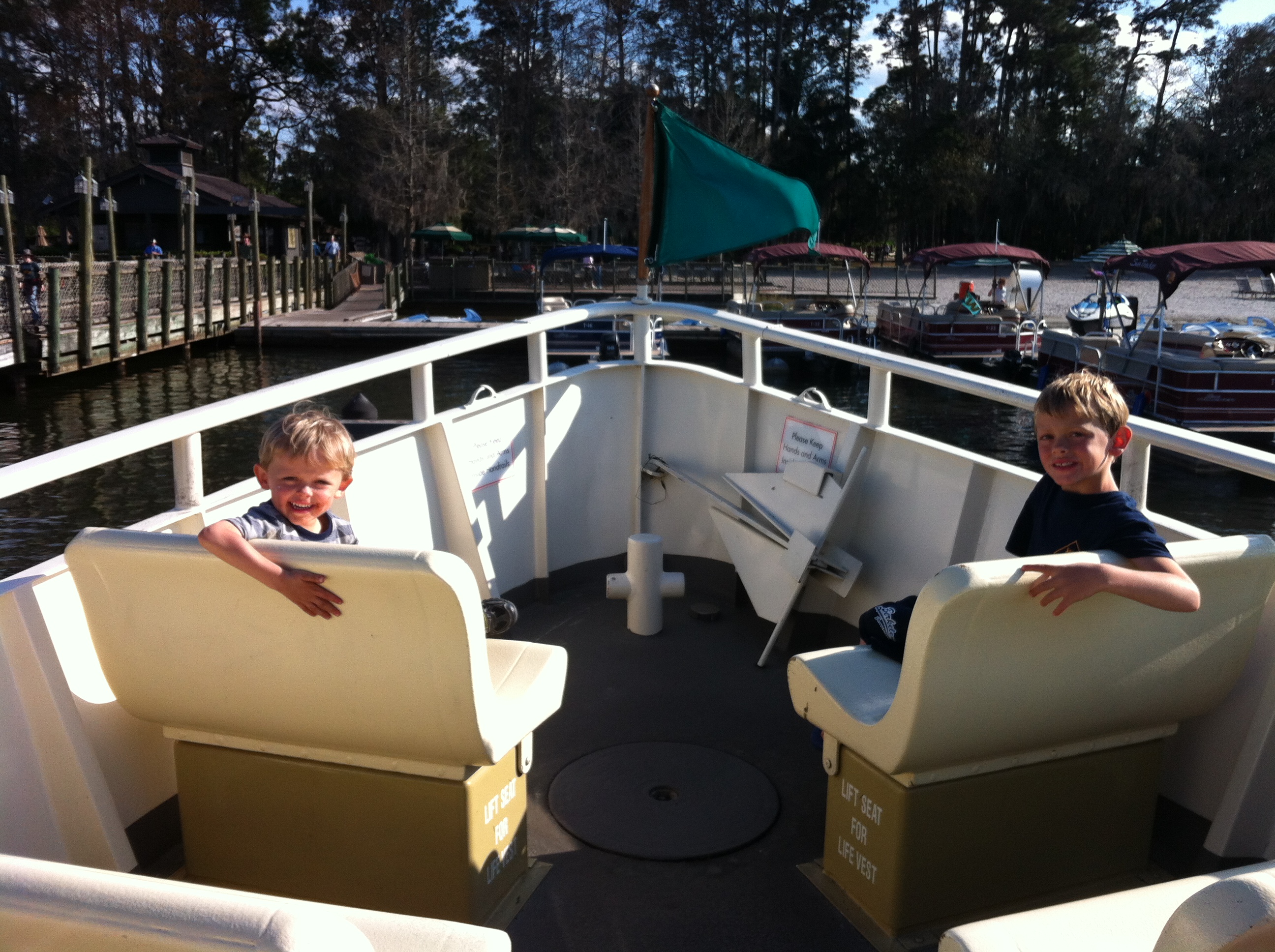 This pool was perfect for the kids. There was a larger pool with this large slide and then a smaller pool for the littler kids. After the swim, the boys dried off and we went for a bike ride. Our first stop was to the front of the campground to see the horses. Matty loves the horses. Next, we biked back over to the Meadows swimming pool. Caiden was in an archery class, so the boys each got a Mickey ice-cream and posted up to watch him. From the way their faces look, I’d say they liked them :). From here we biked down to the marina. Both boys wanted to go on a boat ride, so we hopped onto the shuttle for the Magic Kingdom and went for a ride.