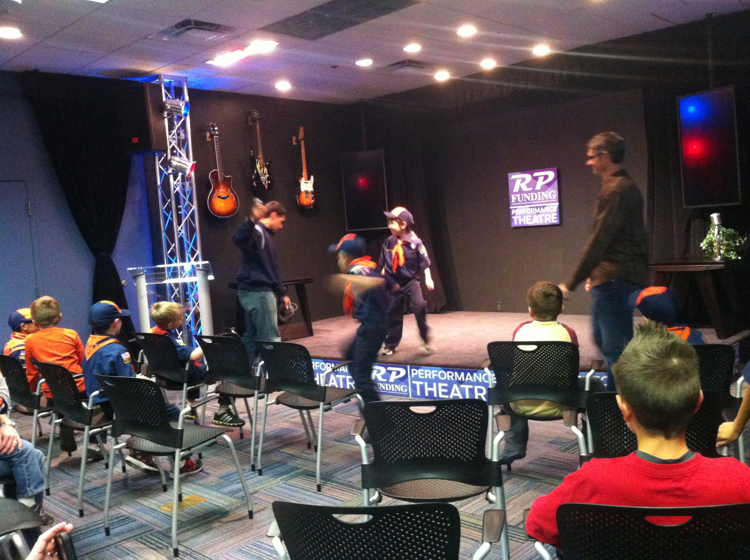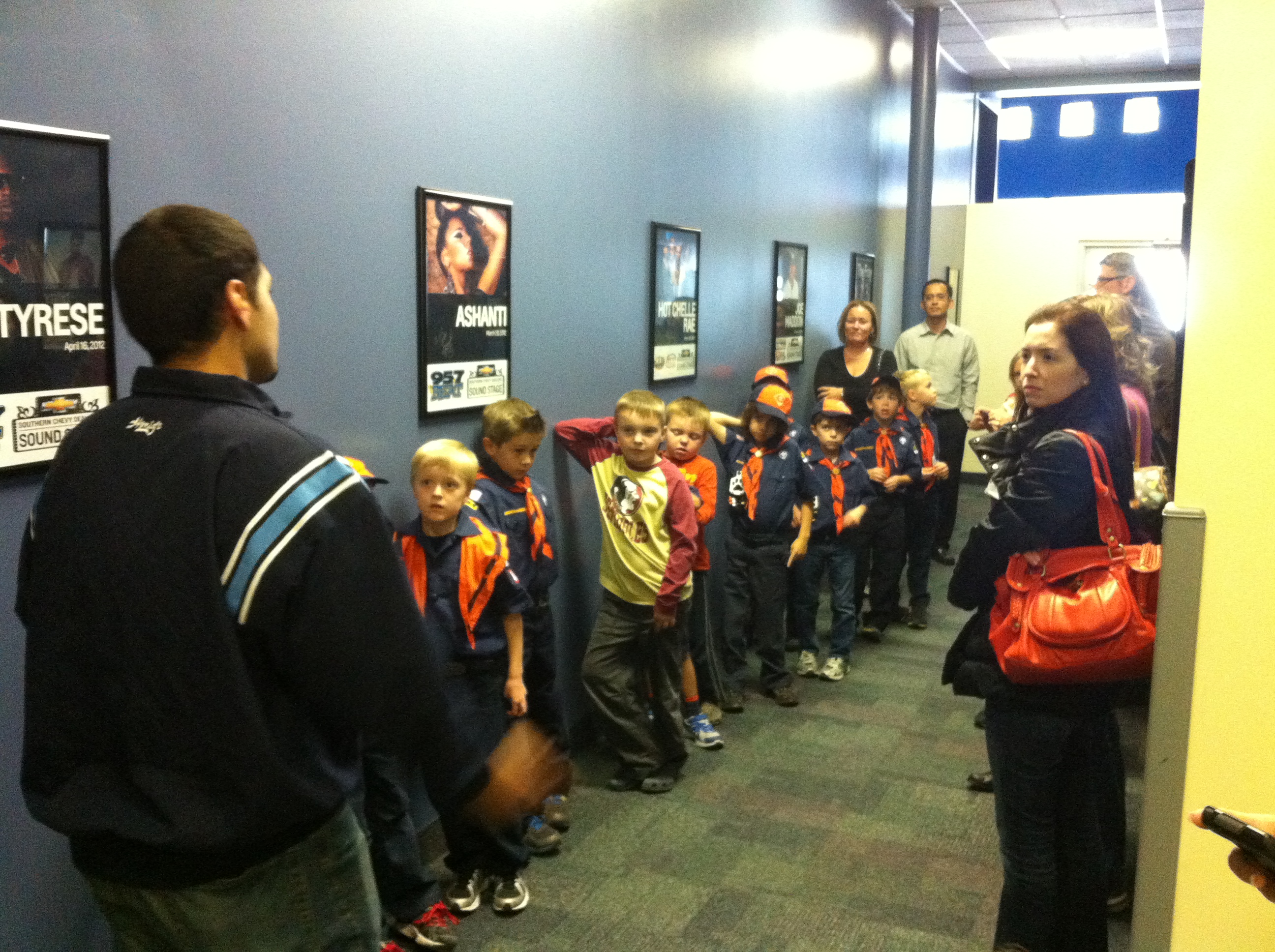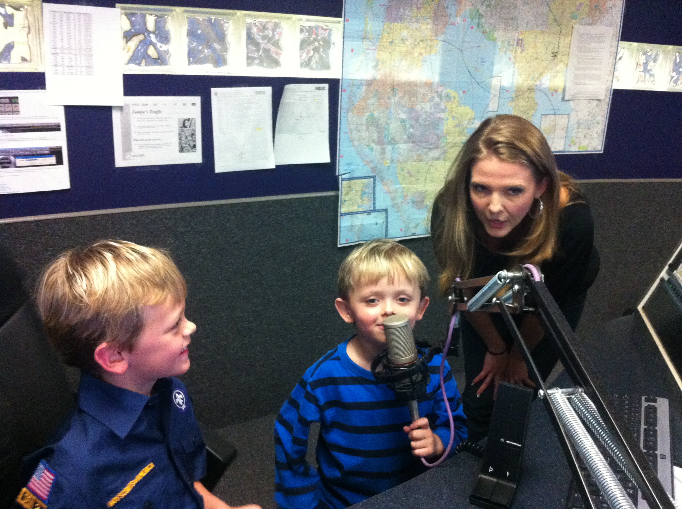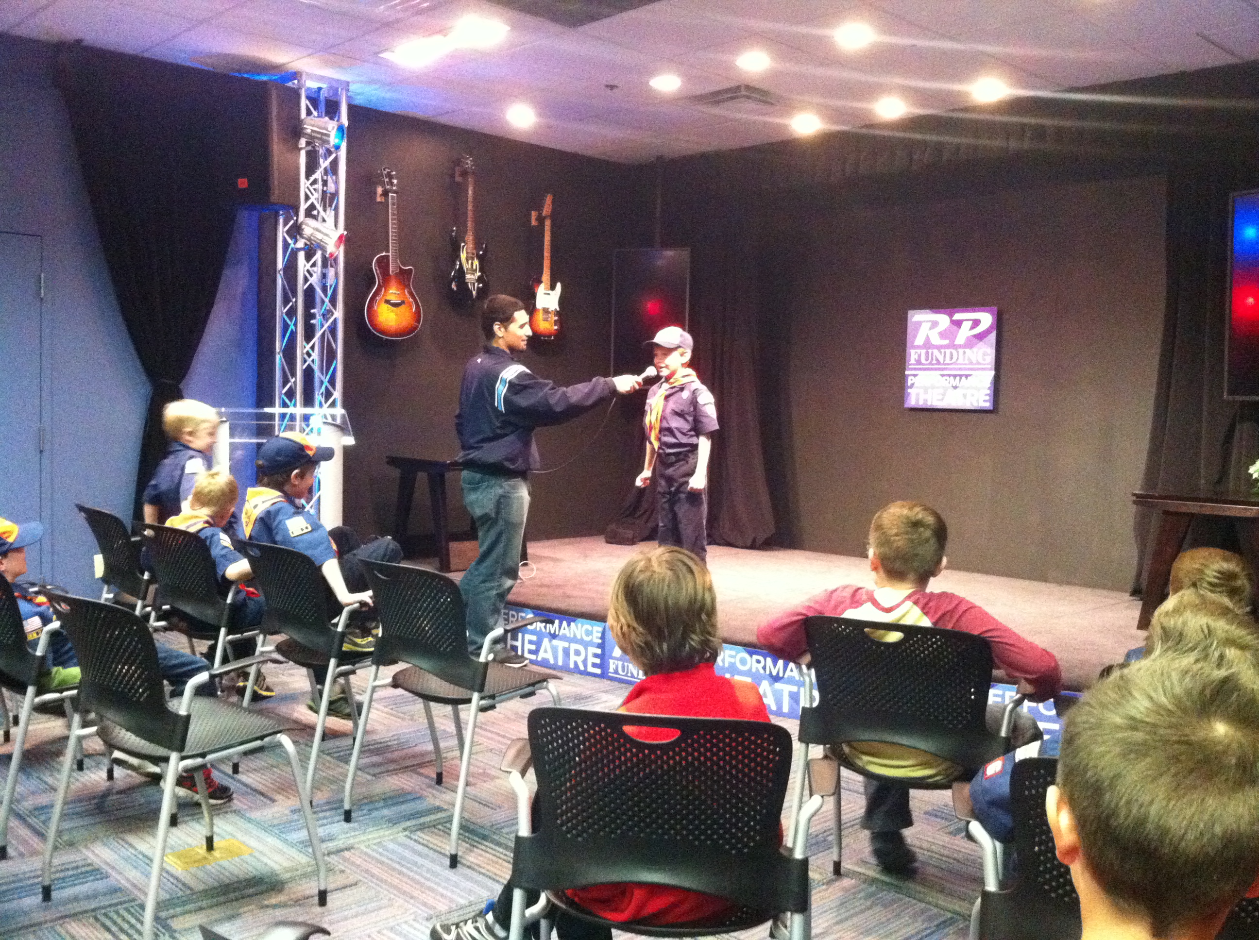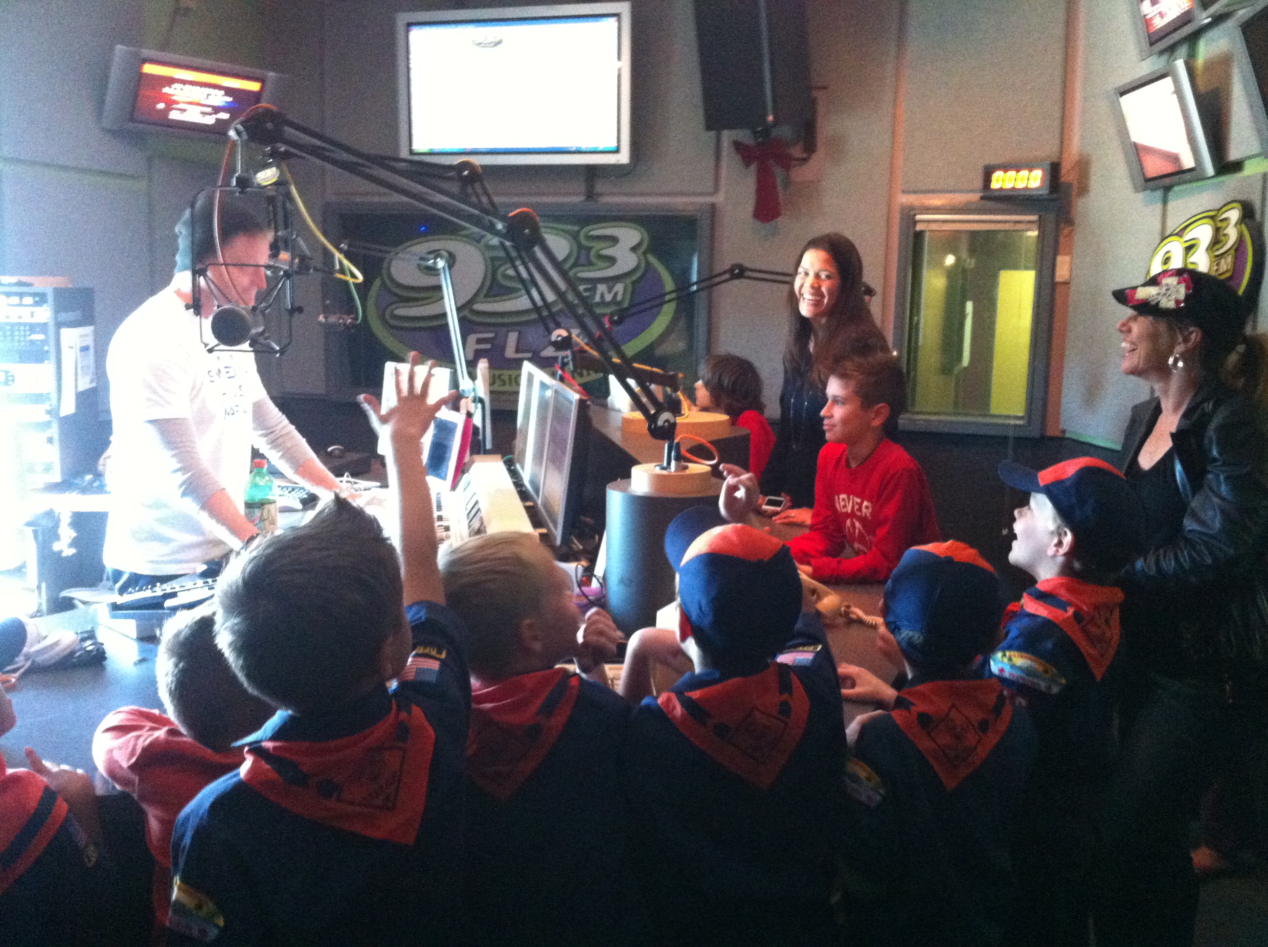 One of the big outings this year for the Tiger Cubs is to tour either a radio station or a tv station. We were fortunate to have Courtney be able to help us set up the tour. The boys got to see several different DJ’s working their specific radio channel, talk to Scotty Davis from 93.3, see the Monster Truck and the radio towers, and perform on the guest performance stage. After the other Cub’s left, Davy and Matty got to head back to Courtney’s desk in the traffic department to see how things are done. They had a great time!