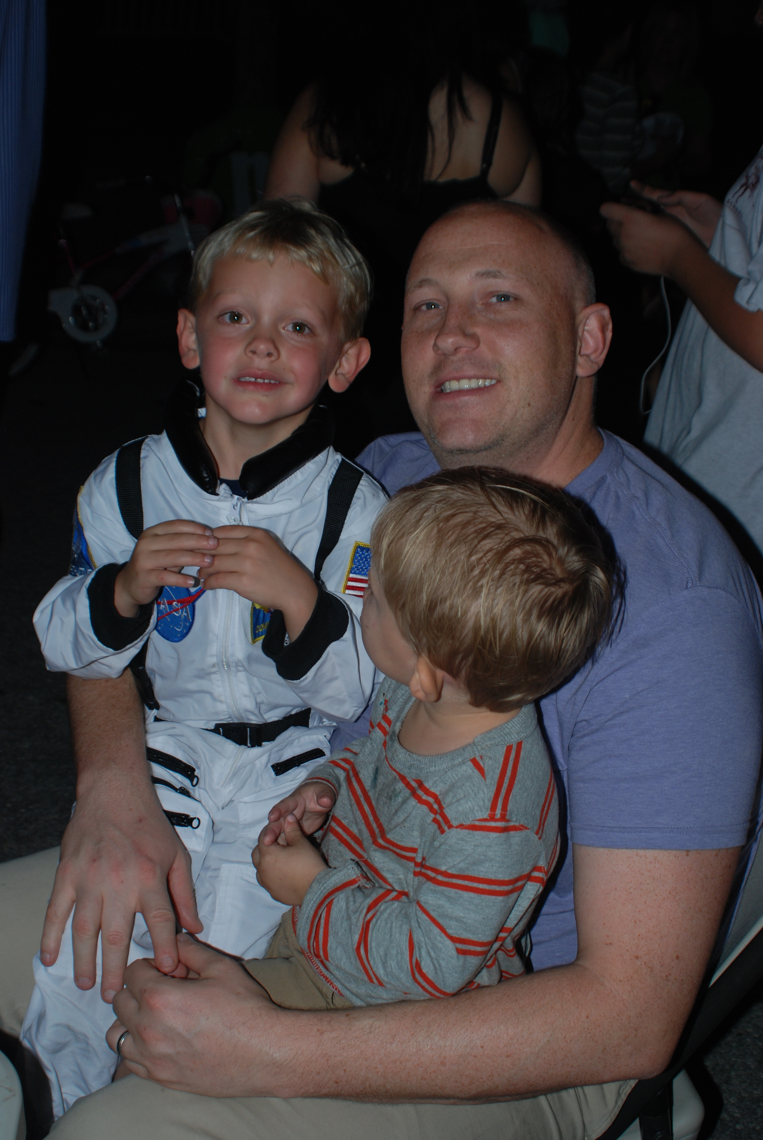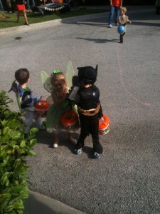 It is finally here!! Happy Halloween!!! The boys were so excited all weekend that they were going to get to go trick-or-treating. This year the neighborhood started off Halloween weekend with an organized block party on Saturday night the 30th. Over on the bridge to the village they set up the annual haunted house, so this seemed to be the perfect location. There were two bounce houses, tables and tables of pot luck food brought out, a bon-fire, and the Trimble’s projected the Wizard of Oz onto the side of the their house for movies on the lawn. The kids got to dress up in their costumes and they had a great time. There must have been at least 100 people who came out for the party. By the end of the evening we ended up in front of the Nugent’s home roasting marshmallows and making smores.