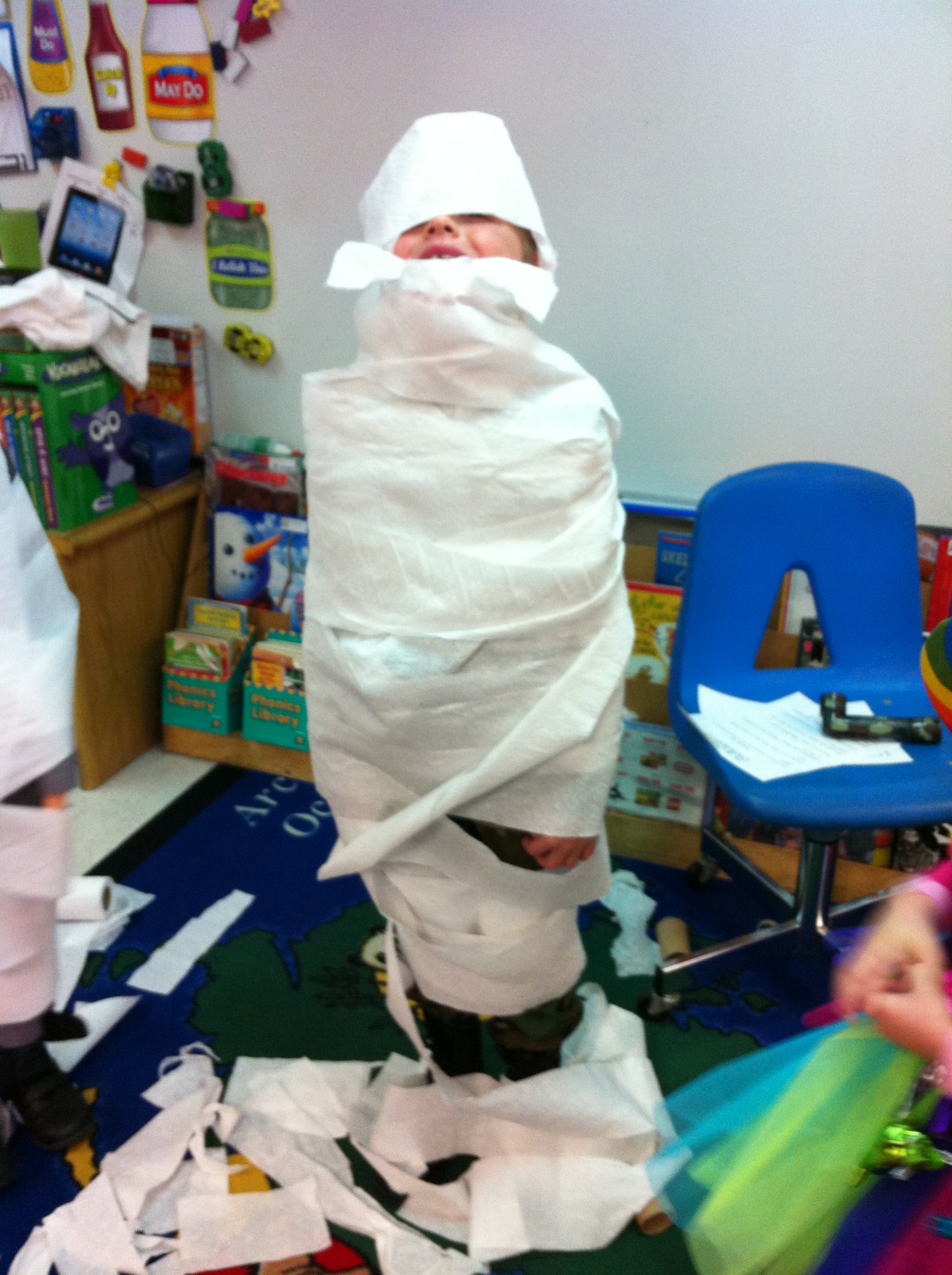 Every year the lower division at Berkeley hosts an annual Halloween Costume Parade. The children line up in their classes by grade and parade around the mound to fun spooky music. After all of the grades have entered, each one is presented to the parents for photo opportunities and then they parade out. How cute is Mrs. Lewis dressed up like an MnM… Afterwards, the children get to have a special party in their room…. This year I was on the volunteer list and got to help assist the mummy wrapping center.