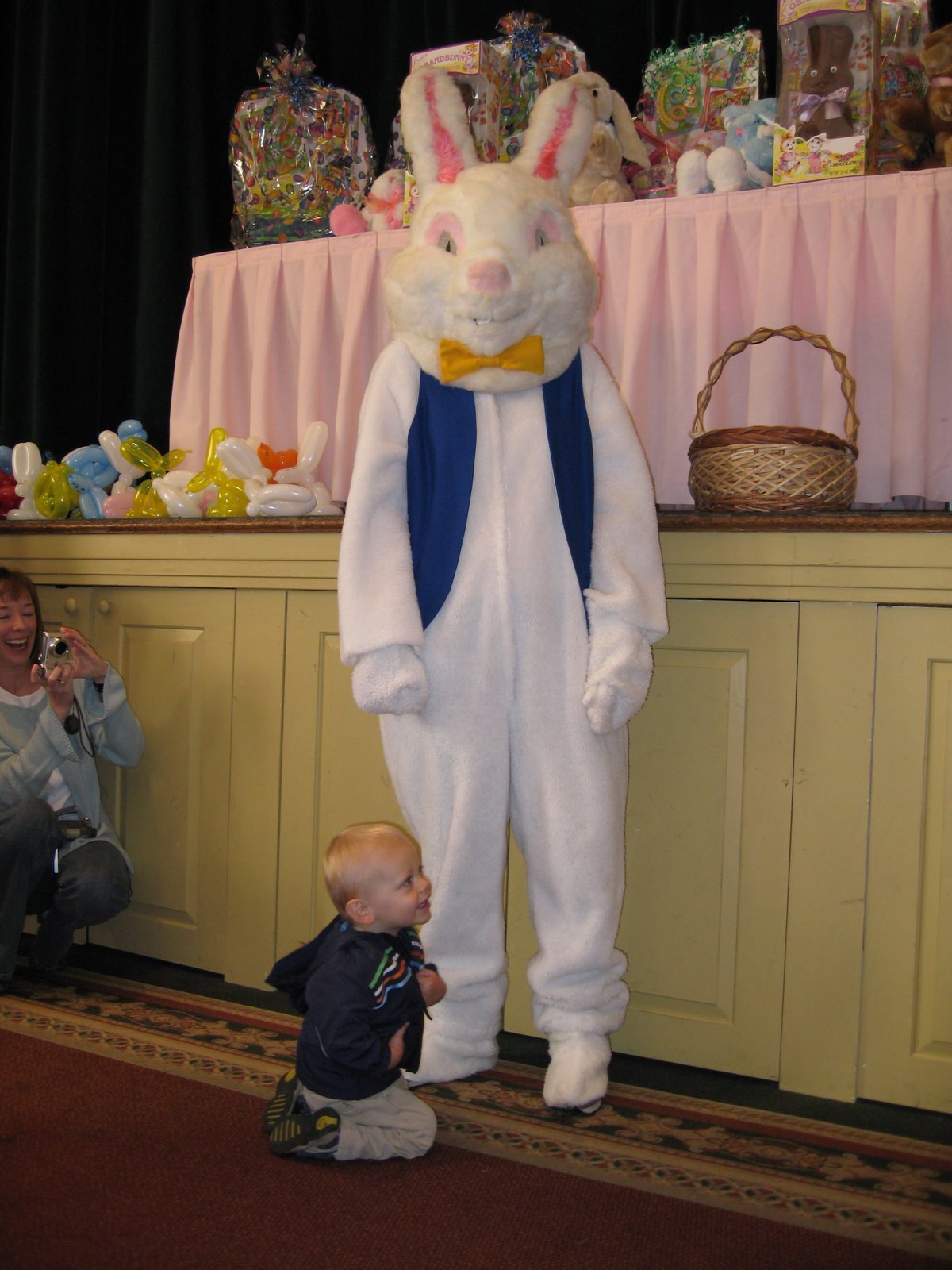 Grayson came over earlier in the week and invited us to attend Palma Ceia Country Club’s annual Easter Egg hunt. How much fun is that. We left at 9:30 and walked over to the Club House. There were all kinds of activities for kids to do: Cookie decorating, face painting, bean bag toss, arts and crafts, etc. The egg hunt was divided by age, 1-5 on the inside and 5 and up outside. There were over 4,000 eggs hidden. Whitney and I decided to sprint to the back of the room to let Grayson and Davy get a couple of the eggs before the bigger kids came running by. Davy was so cute, he held up each egg and said, “Ball”. However, it wasn’t the egg hunt that I will remember the most from today….but the way Davy stalked the Easter bunny. He was in love with the Easter bunny. There were so many kids lined up with their parents to meet the Easter bunny and Davy kept sprinting up, pointing and squealing. We eventually had to move outside until the egg hunt began.