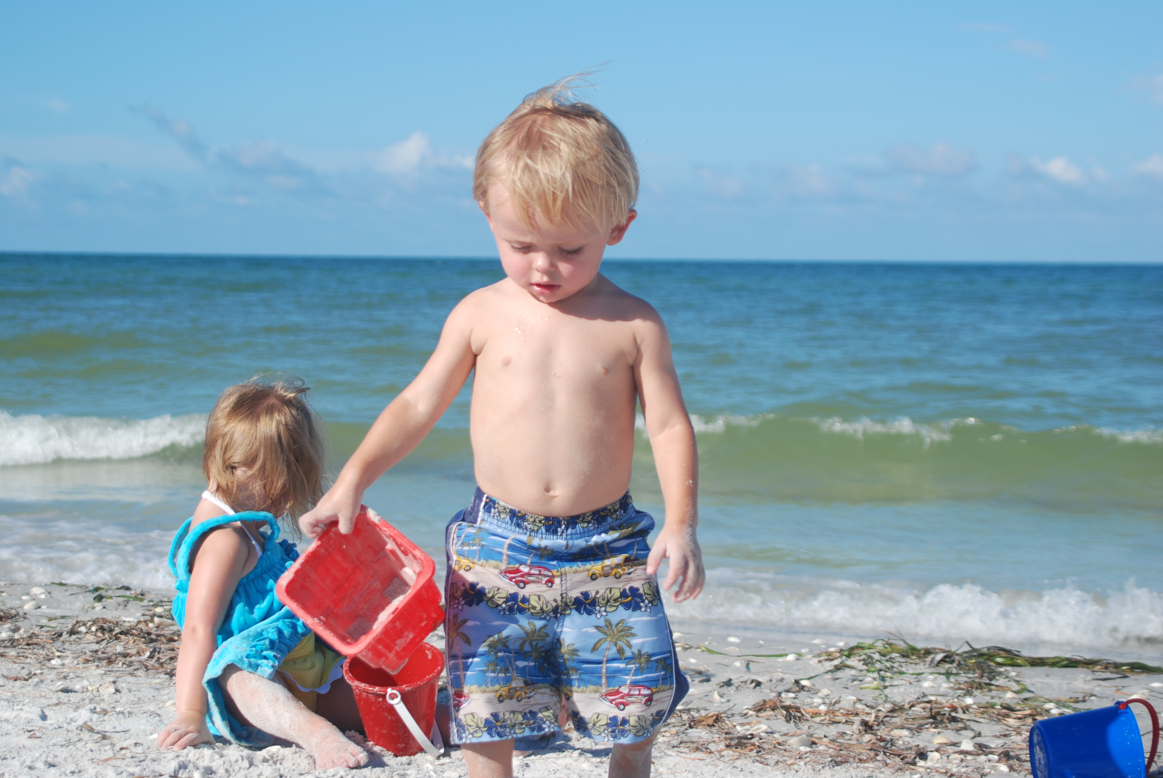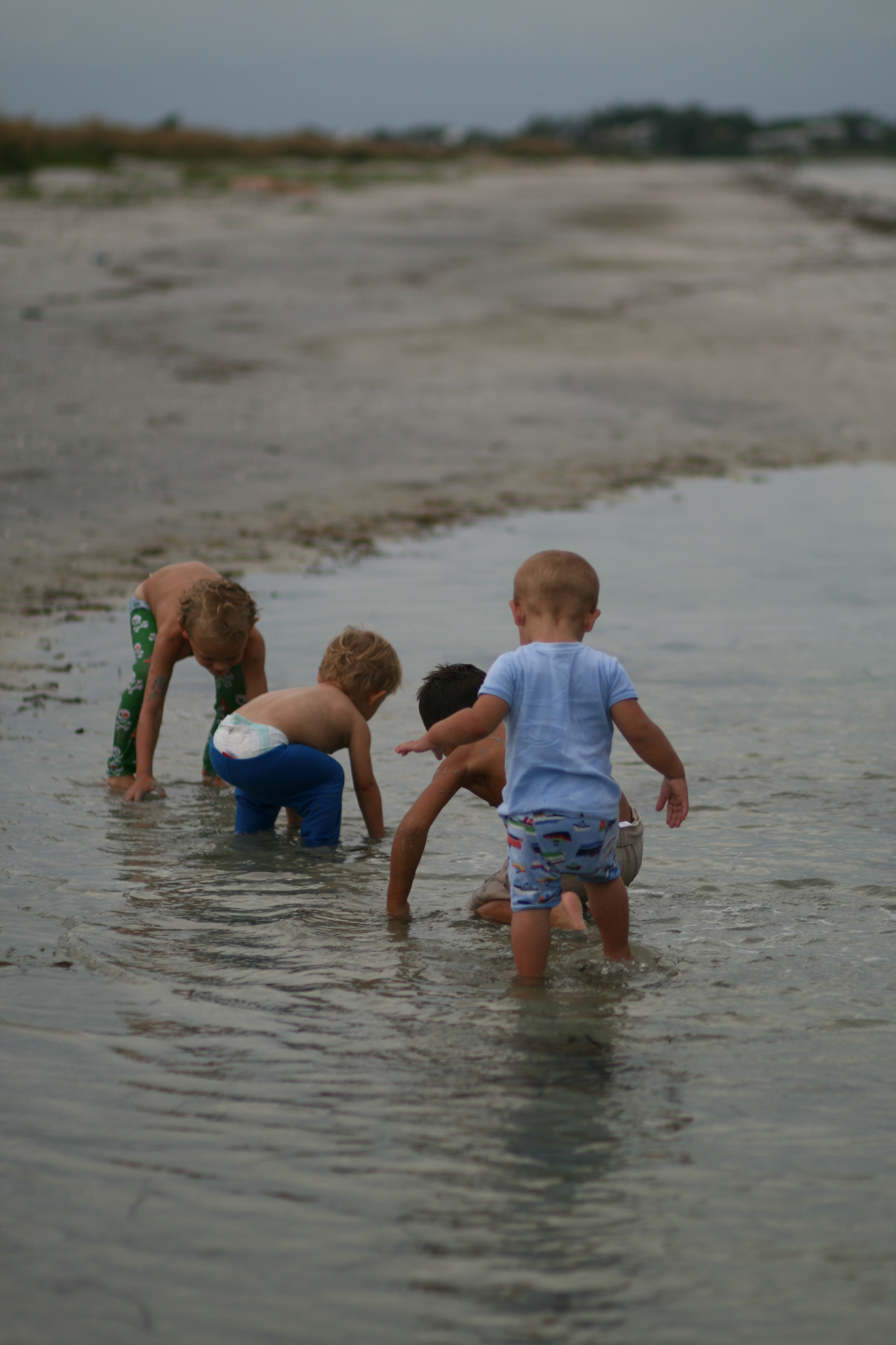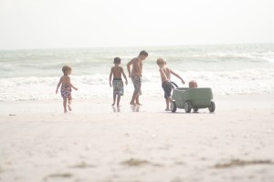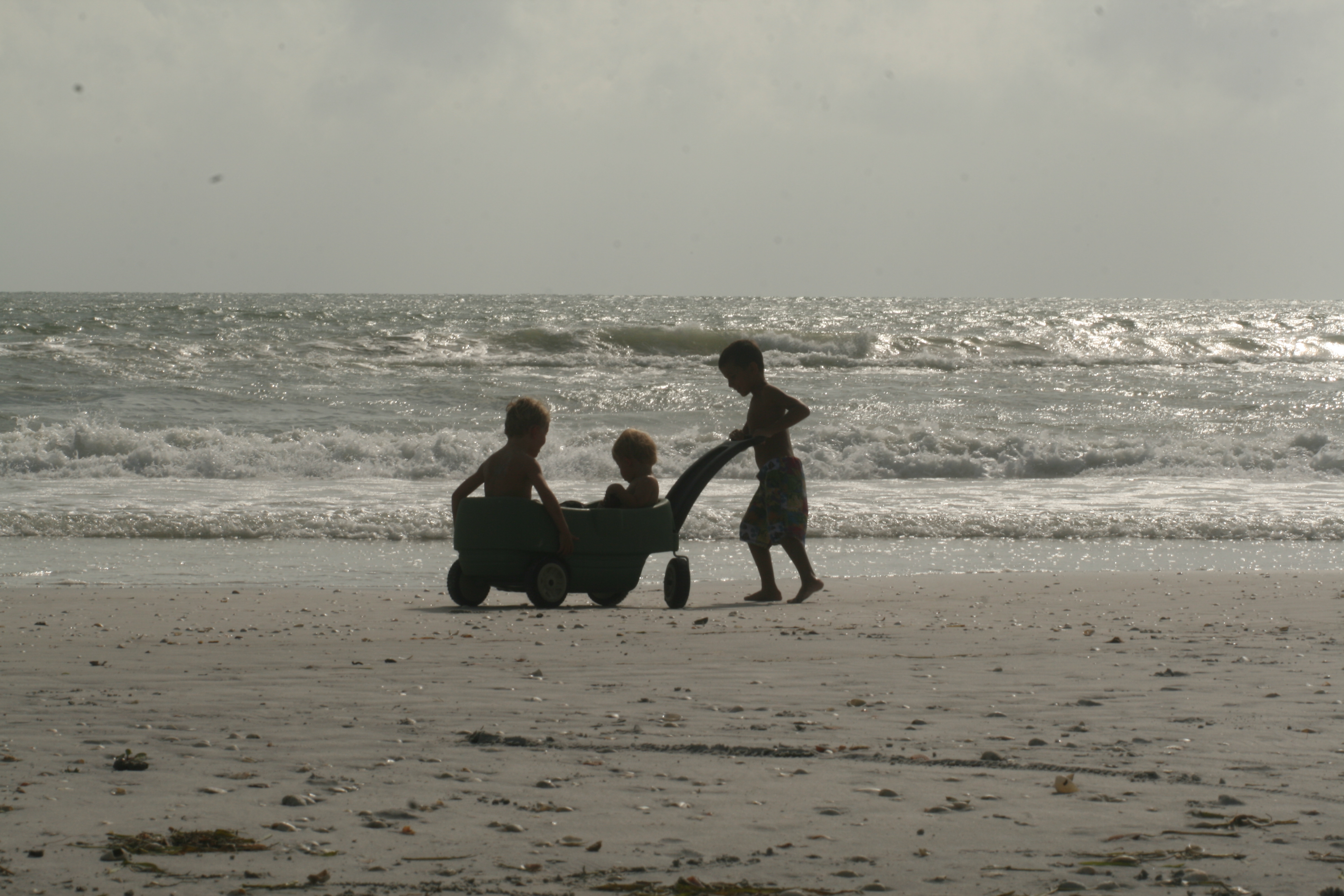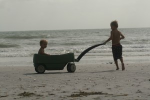 The kids loved having the wagons on the beach. Davy and Connor were always wanting to help us pull the wagons, but in the loose sand with the babies in them they were kind of heavy, so this way they all got to climb in and out and take turns dragging it around…