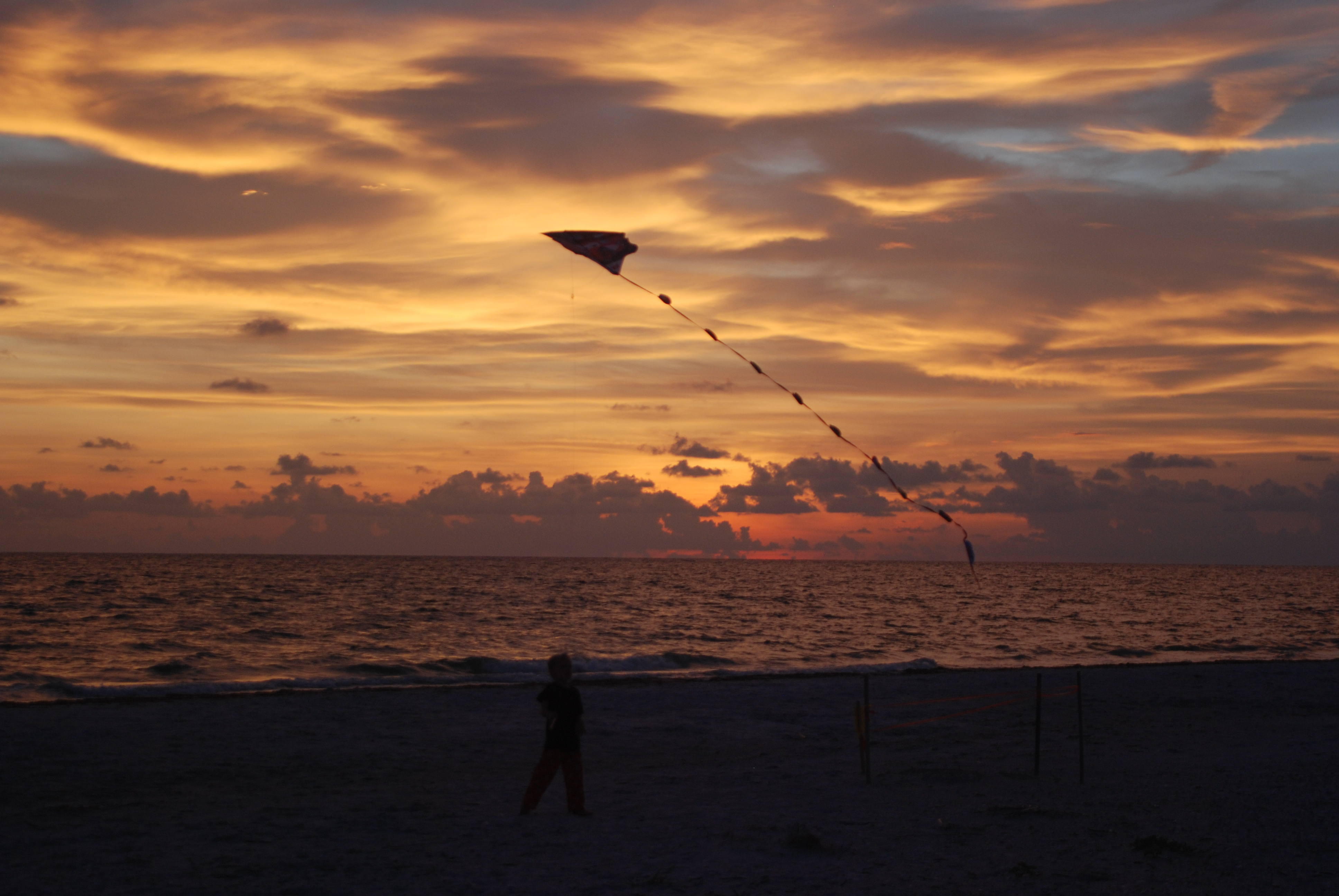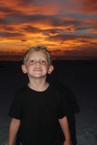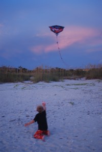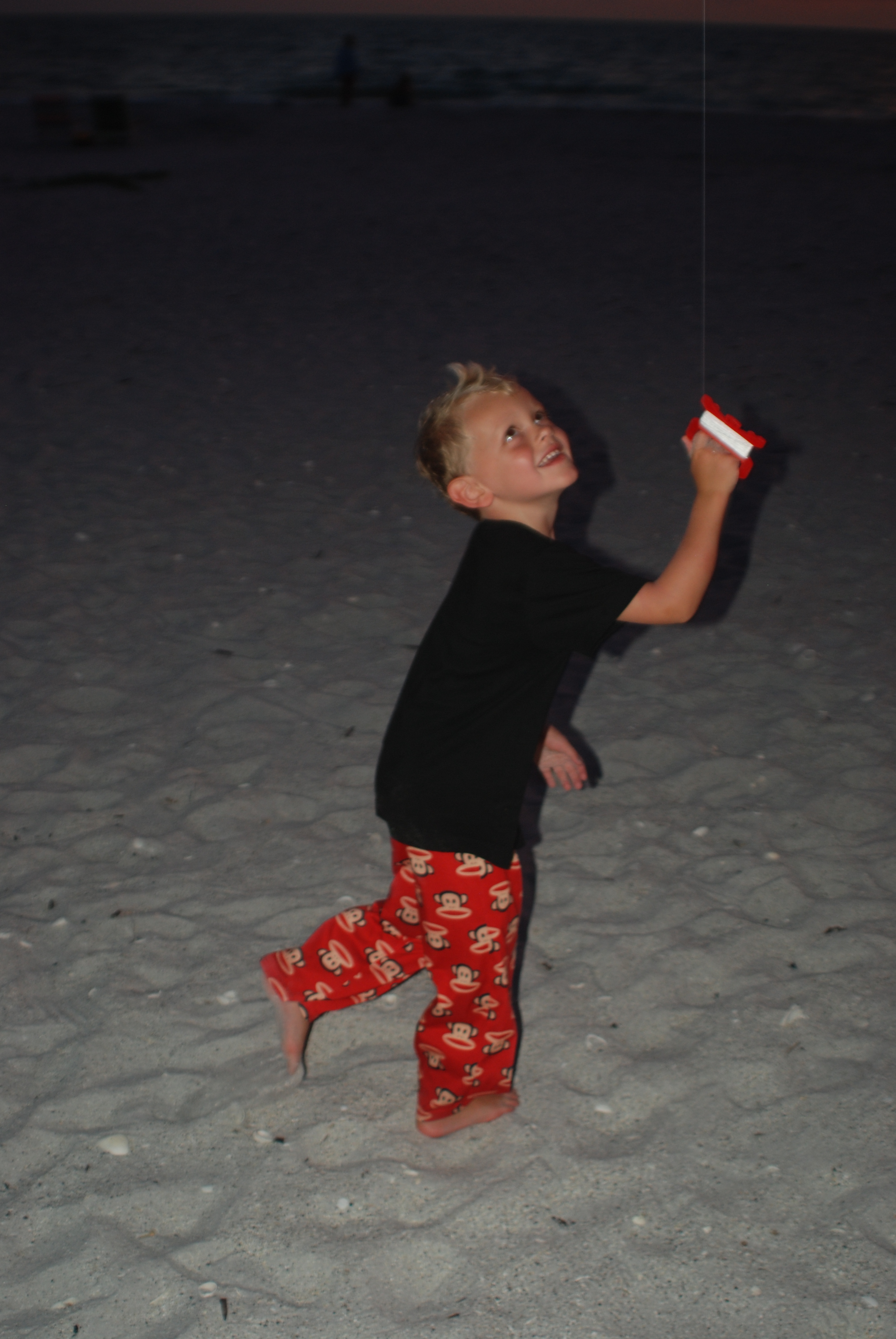 Most of time when you head down to the beach at night it is really windy, so knowing this Kelly went out and bought a bunch of kites for our vacation. We went out two different nights to fly kites, the first night the breeze was slight and there were a lot of gnats so we went in early and then the second night it was perfect. Davy, Colin, and Connor each had their own kite and then Emma and Matty shared one. The kids just had a ball running up and down the beach watching the kites soar into the sky. Davy kept saying that he wanted his to go higher and higher and Matty kept asking to hold and try. We only had to untangle the lines a few times. The weather was nice and we also got to watch a beautiful sunset. Life is good.