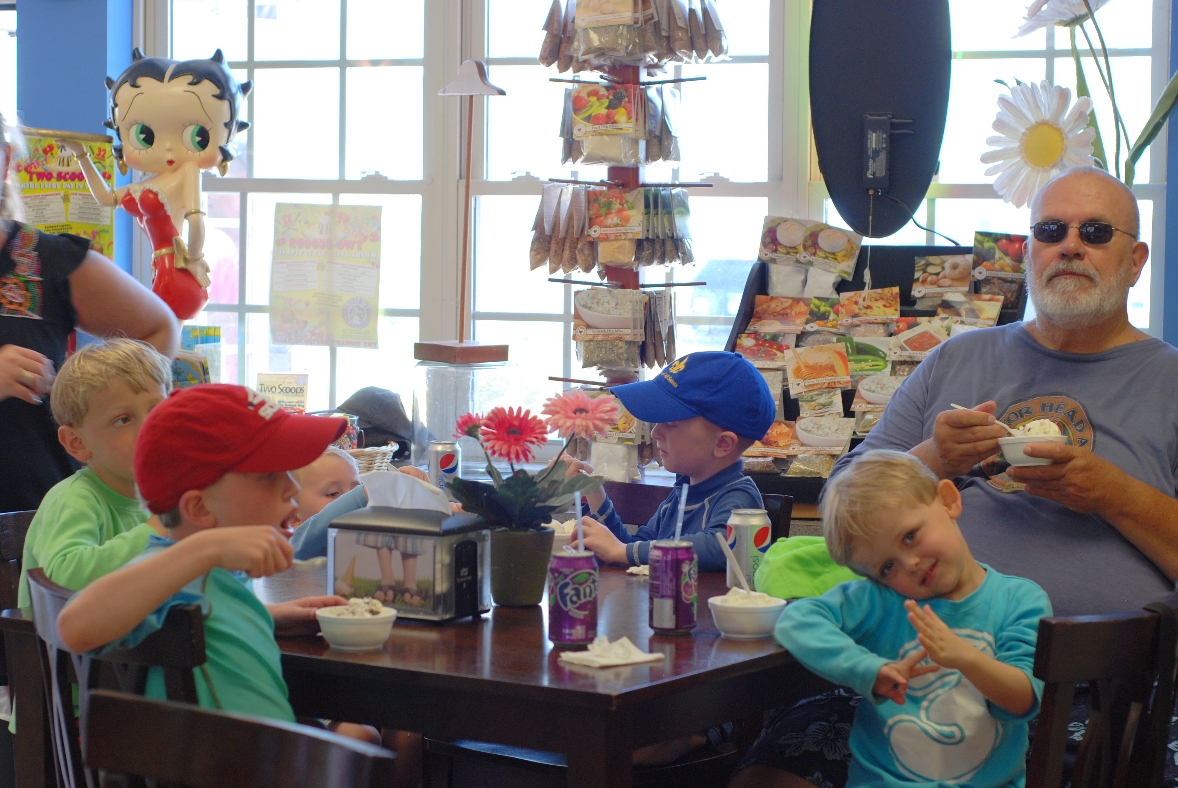 After fishing we decided to walk over to Two Scoops for some lunch. We figured it would just be easier to eat lunch now and then not worry about having to bring them in off of the beach. Hot dogs and ice cream all around!