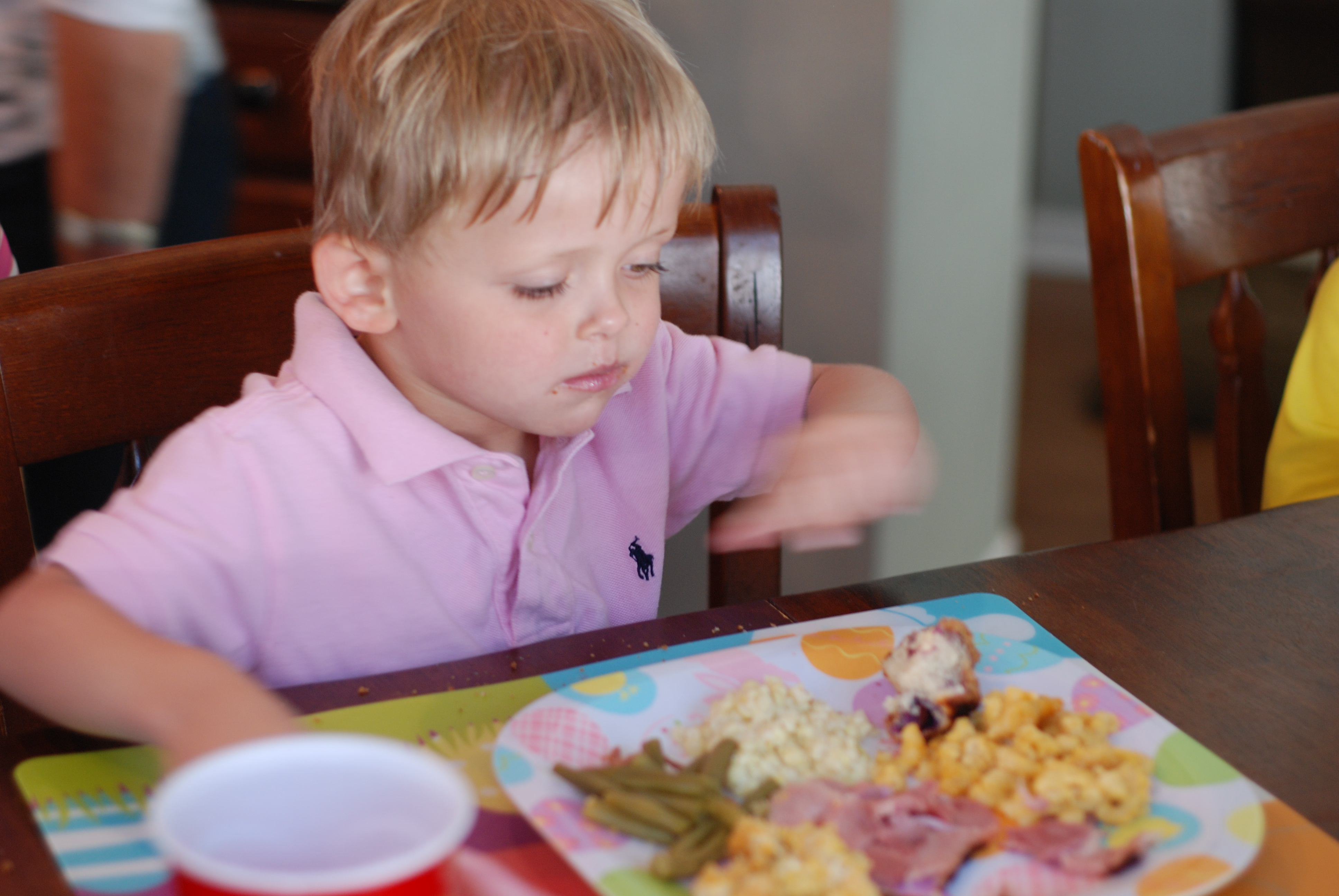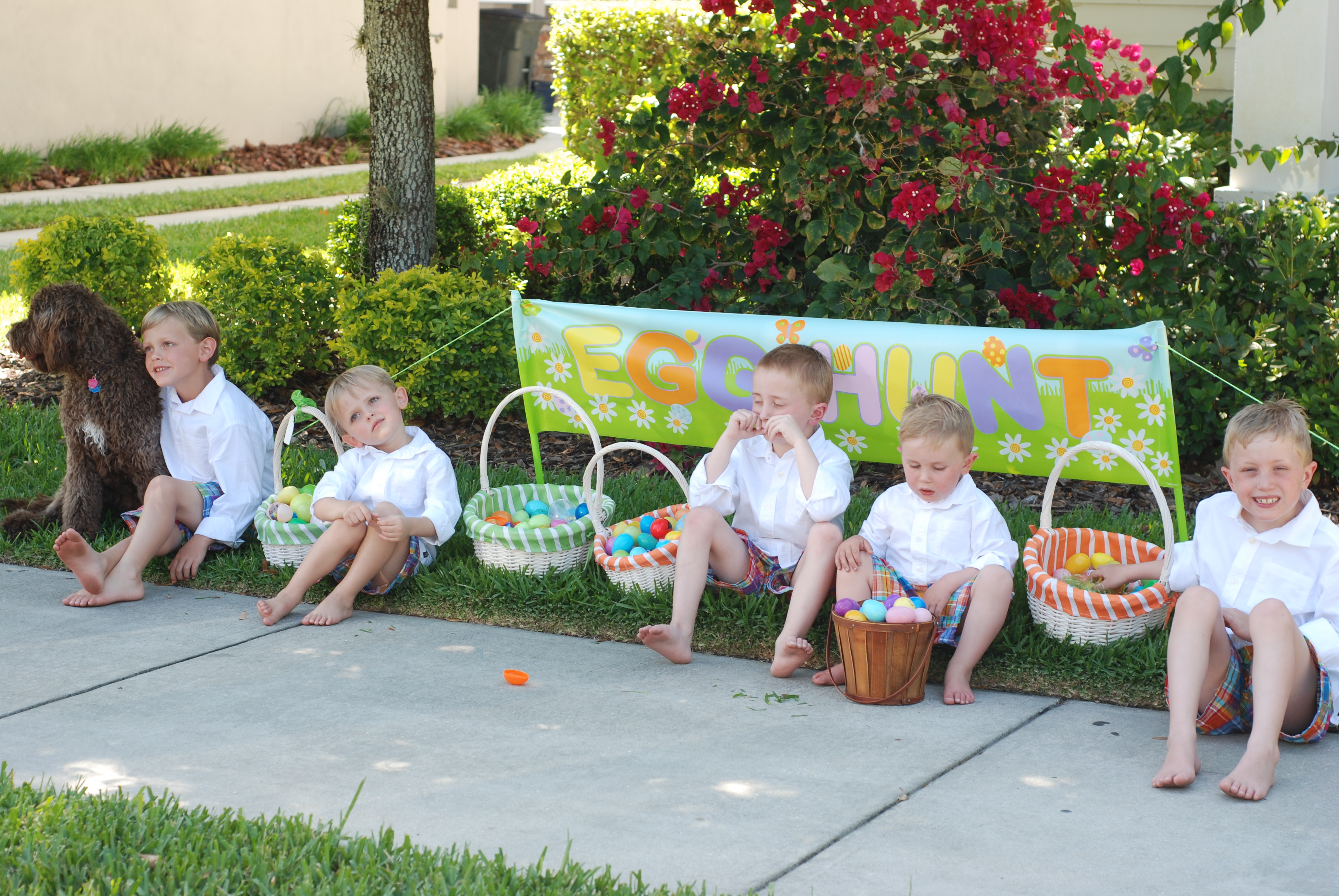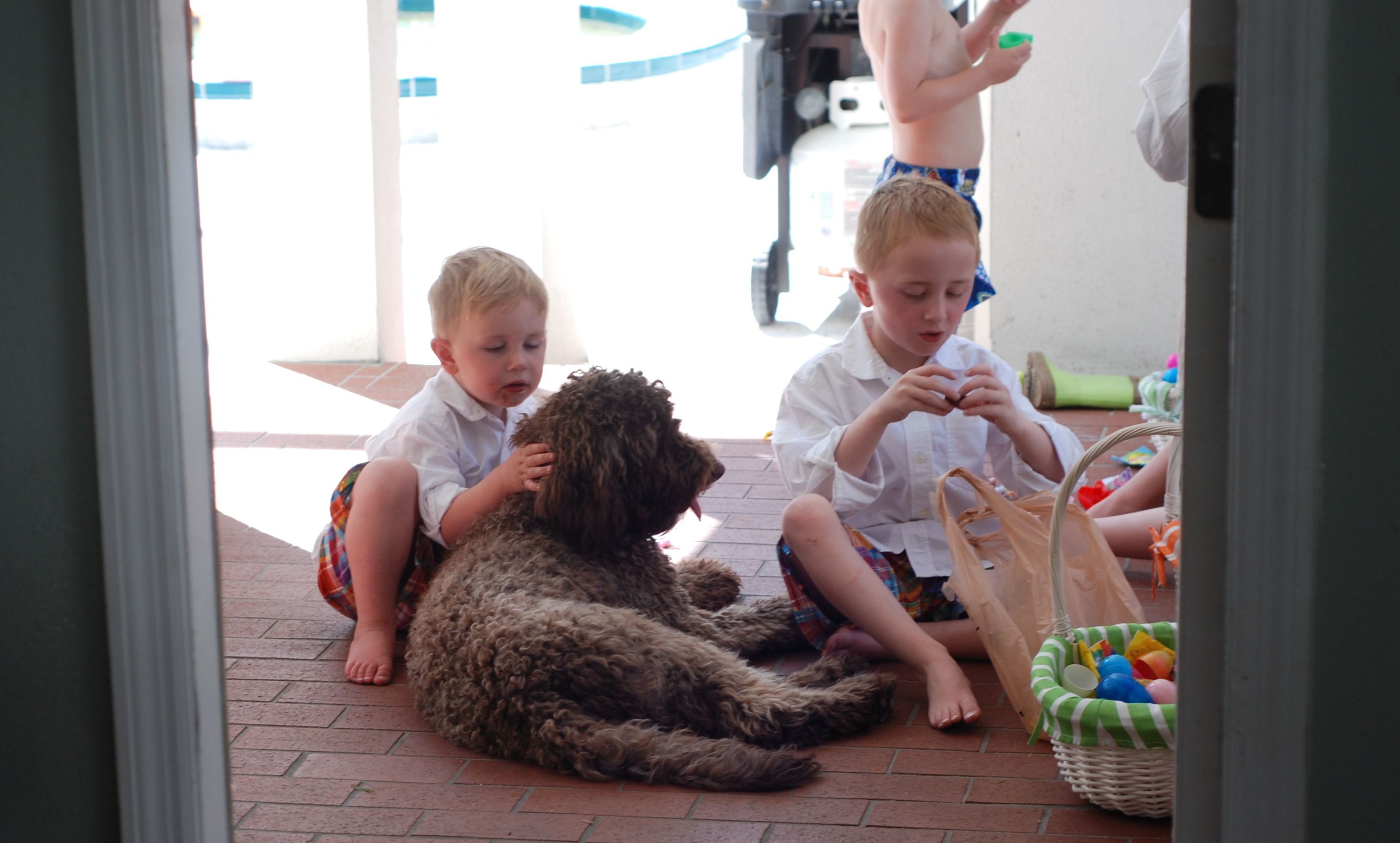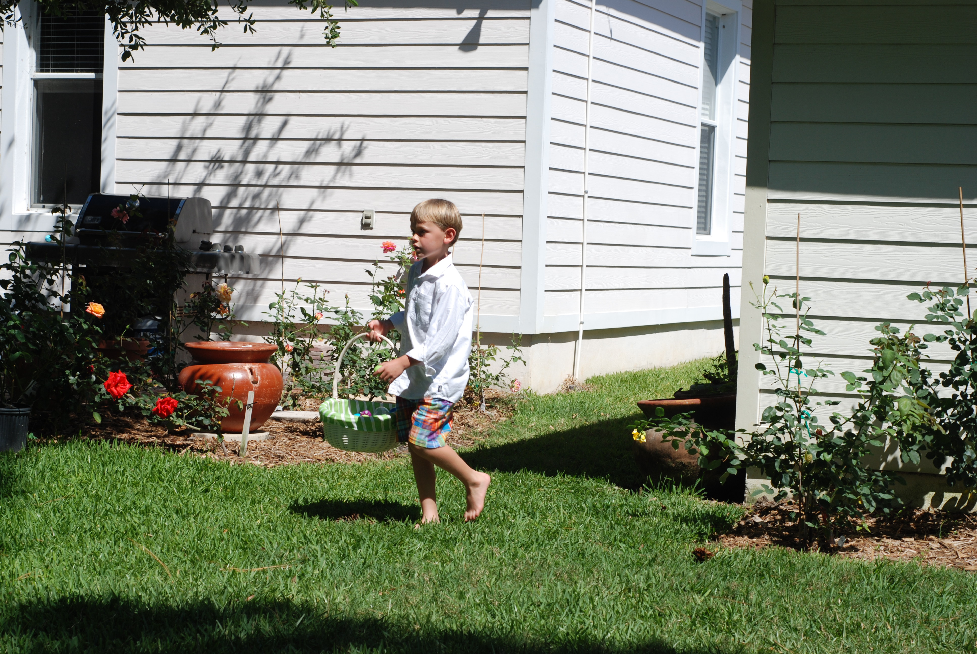 For Easter dinner, we had the whole family together…except for Matt. The kids swam in the pool, we all ate dinner and stuffed our bellies, and then it was time for the egg hunt. The boys hid in our room while all of the adults went outside and hid the eggs. It was fun watching them run around and collect the eggs…all looking for the infamous golden egg. Liam found the egg…next year we might have to have a few more…. 🙂