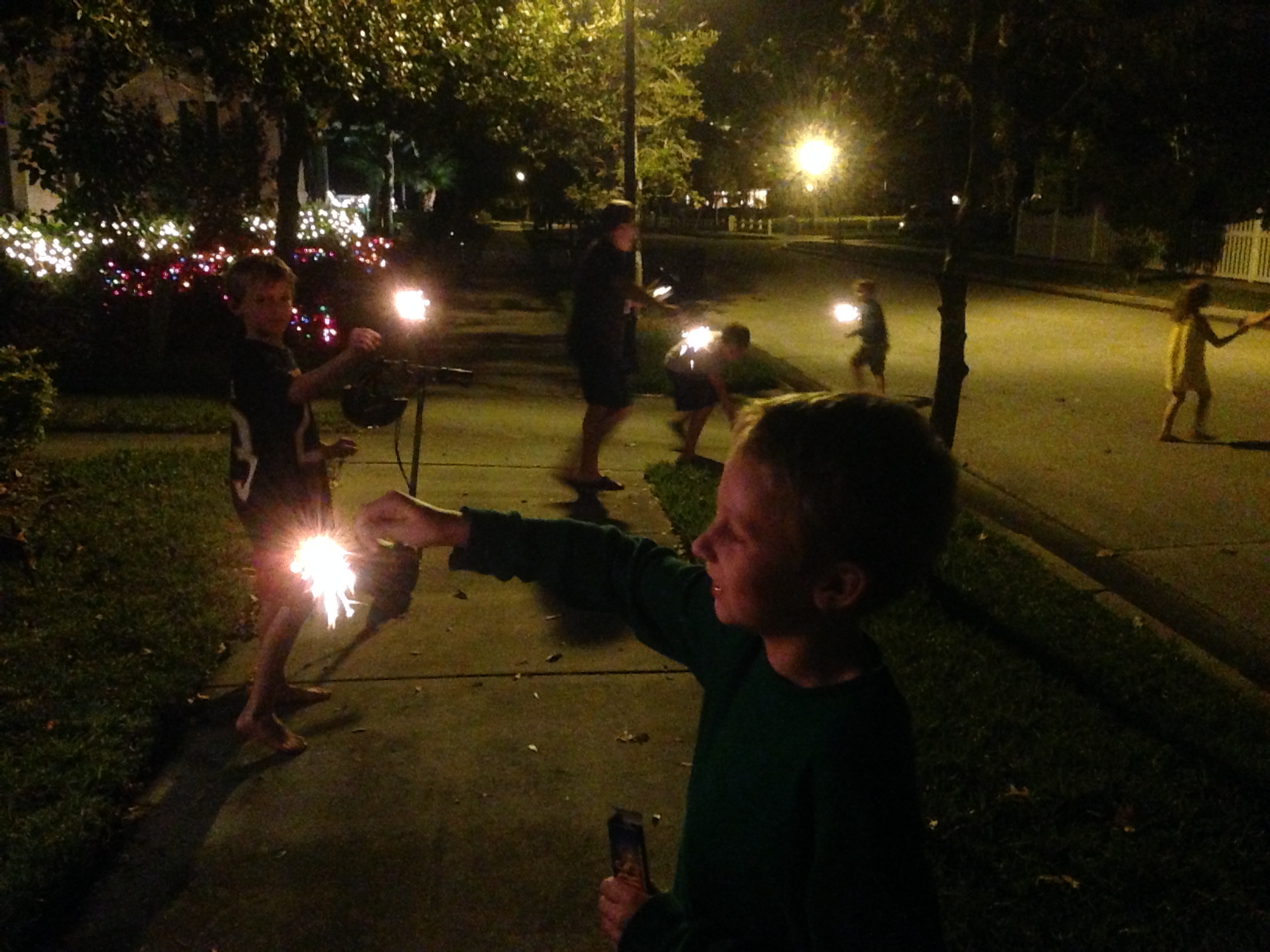 For dinner Brian, Kelly and the kids came over. We cooked filets, lobster tails, risotto, potatoes and drank Greygoose spritzers with cranberry. Yum Yum! The meal was cooked perfectly. Afterwards, we attempted taking a few pictures of the kids, you can imagine how that went, and then it was time to put the babies to bed. The older boys had waited so patiently to light the fireworks and were just wild when we told them it was time. Not too much, just a few smoke bombs, sparklers, and TNT’s. It was enough to satisfy them.