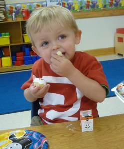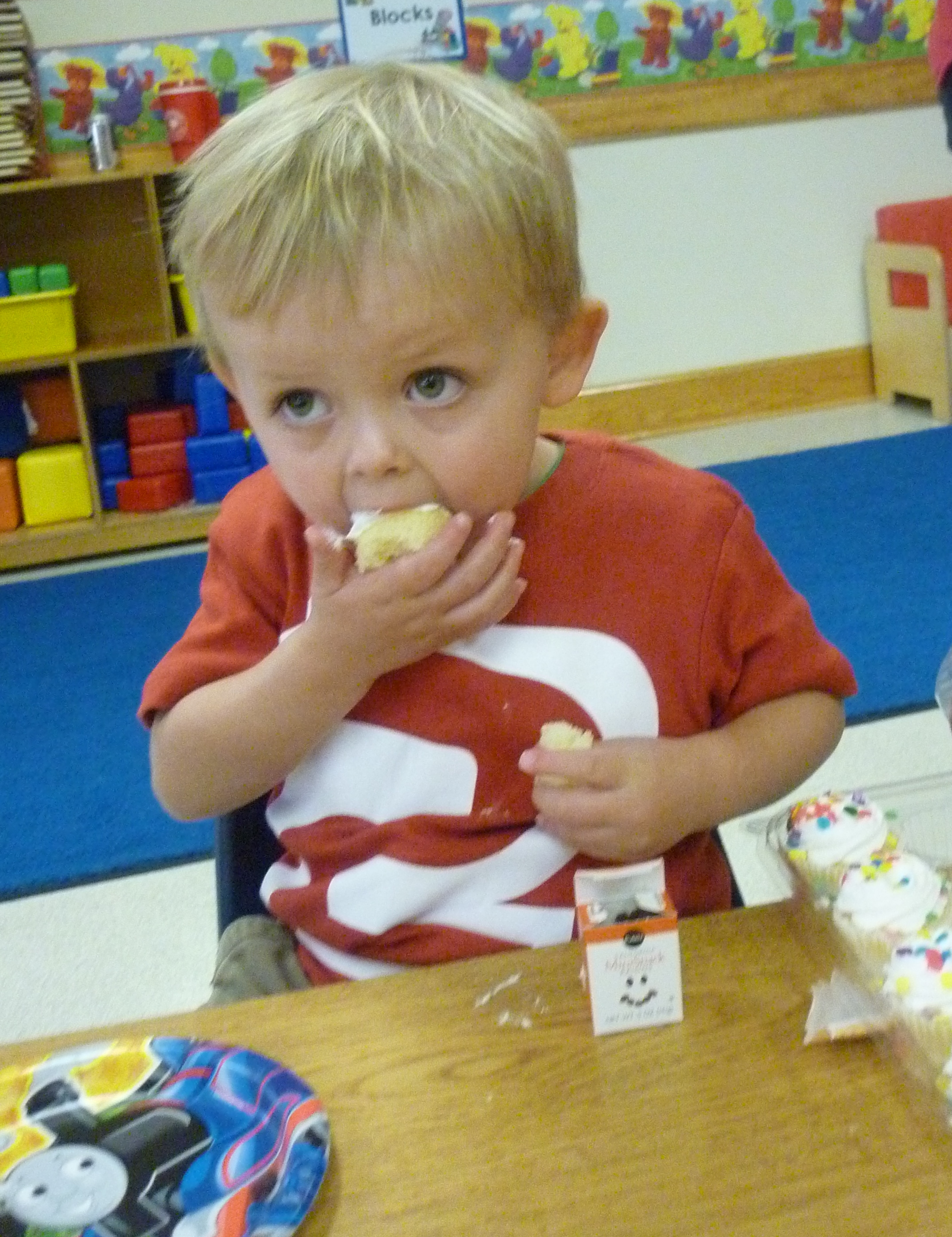 To kick off Matty’s 2nd birthday, we surprised him with a party in his classroom at school today, November 15th. After looking at our schedules, we decided that we would be able to give Matty more birthday time if we started the day before rather than just on his actual birthday. When it came to deciding what theme the party would be, it was between Mickey and trains; and since he was Mickey for Halloween…this was the perfect opportunity to shine something else that he loves. Granny, Andy, Davy, and I all show up to his classroom with cupcakes, snacks, and balloons for everyone… he was so happy to see all of us. The class sang him happy birthday and he just beamed with smiles.