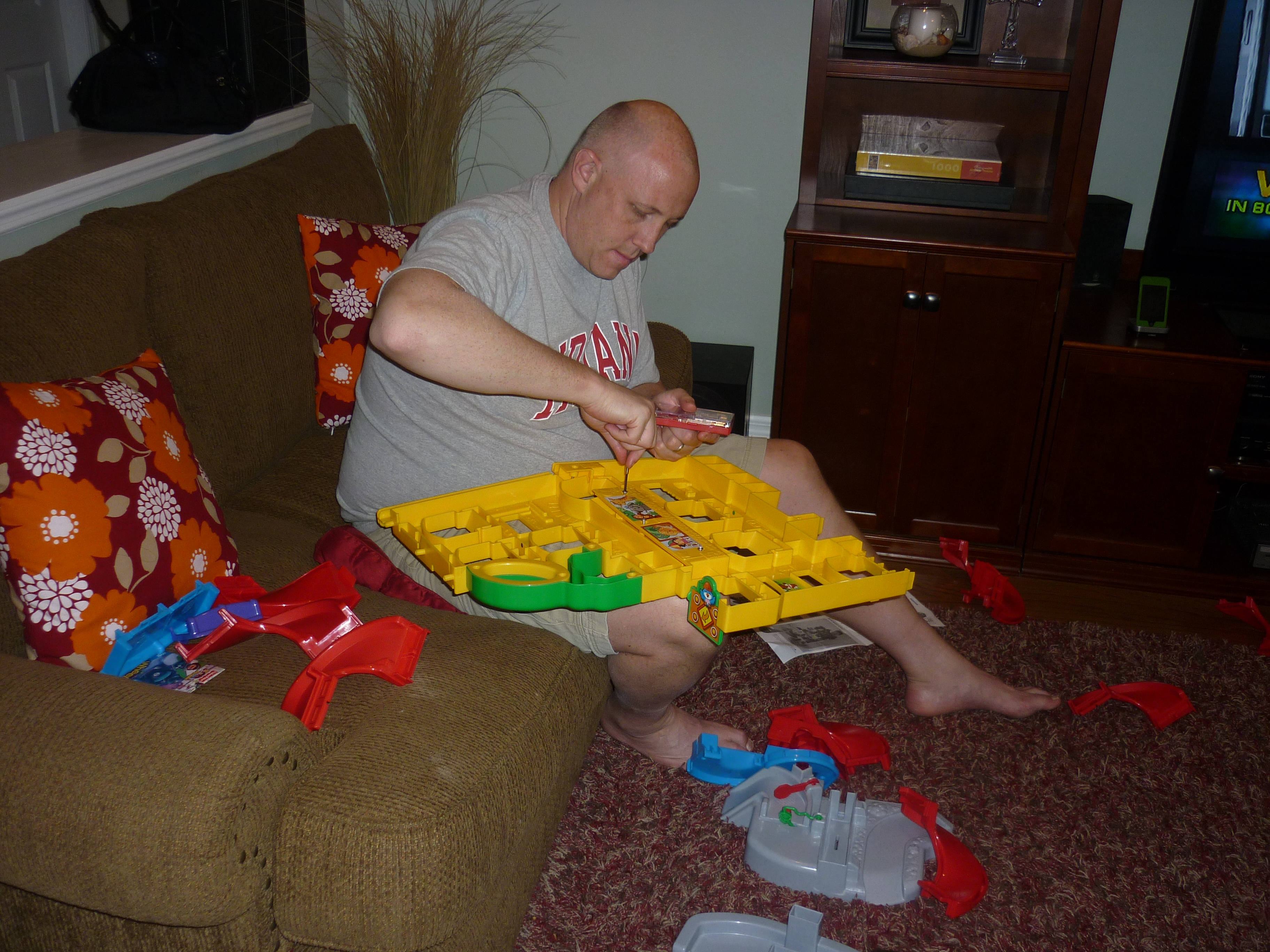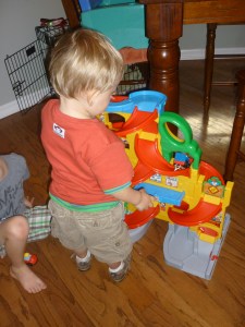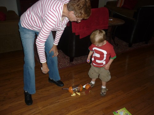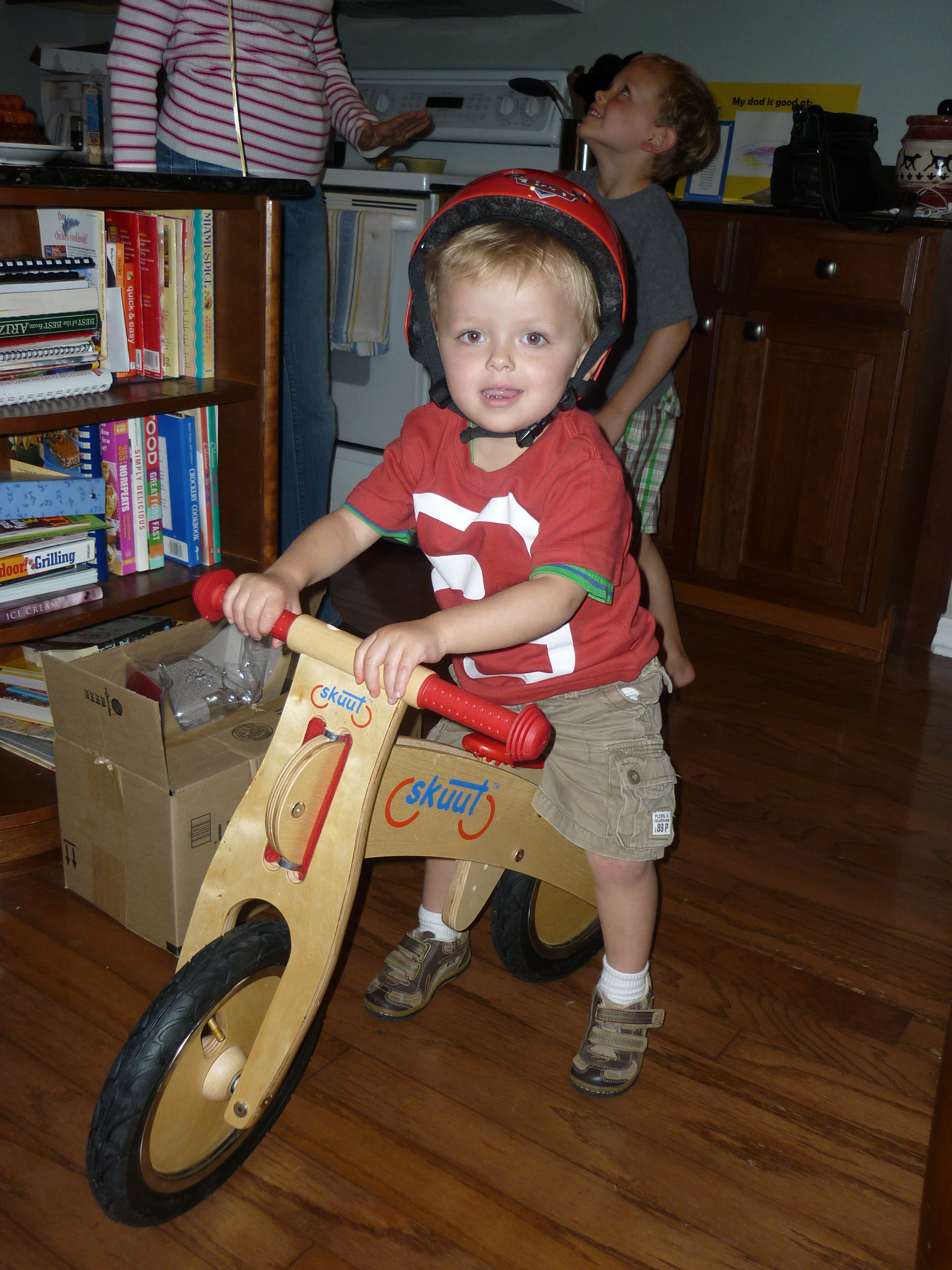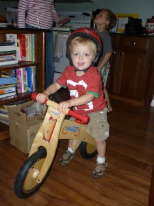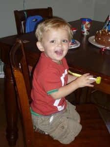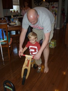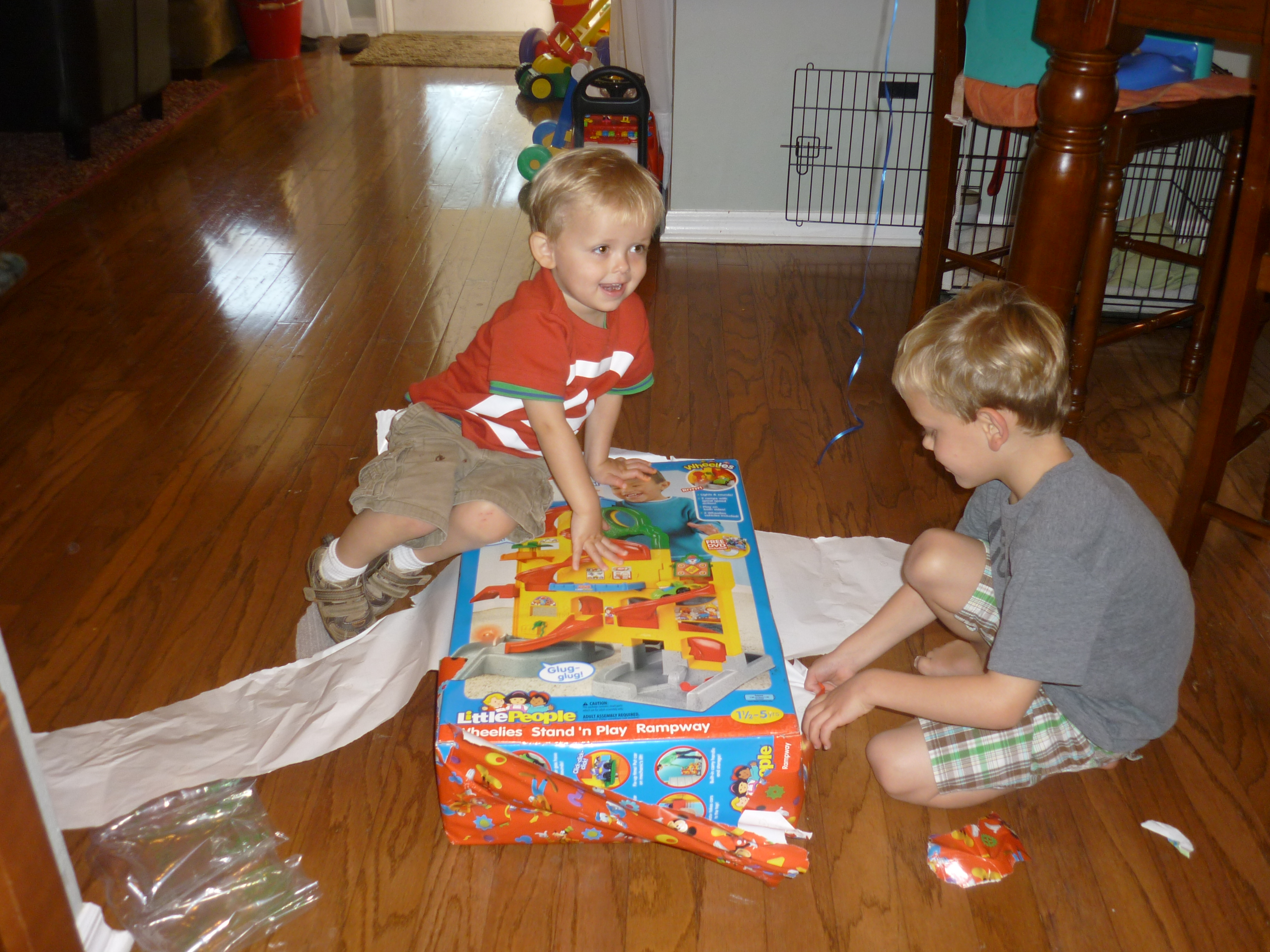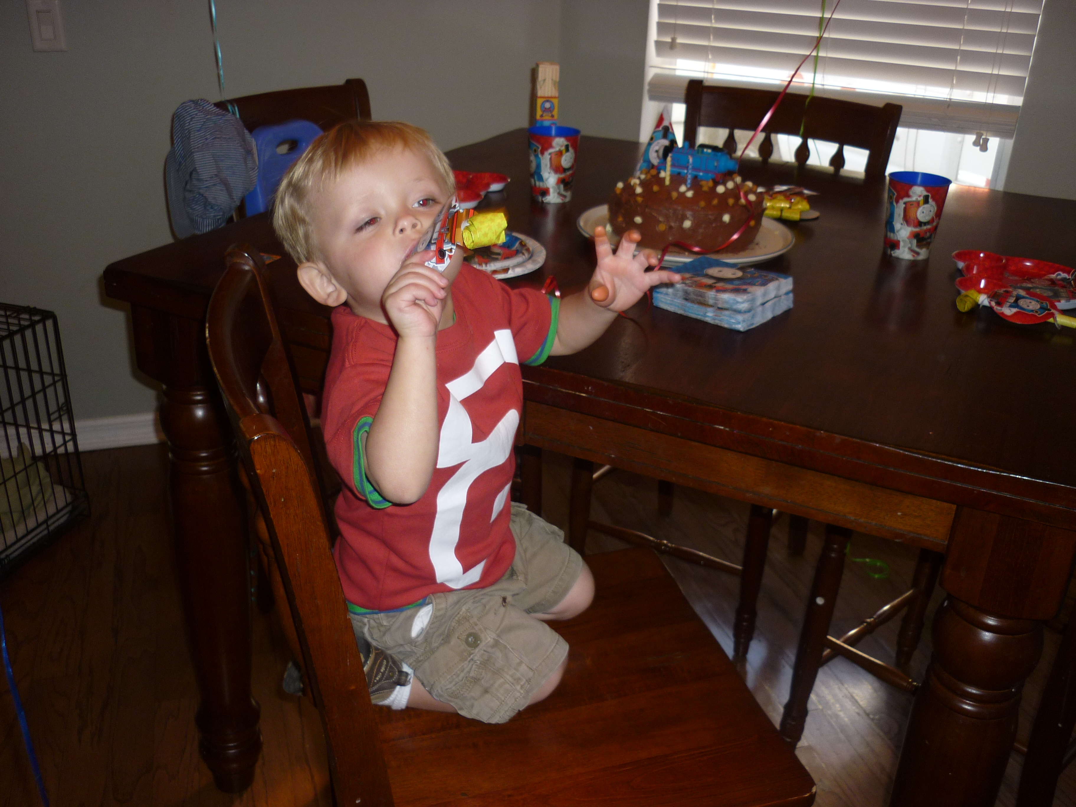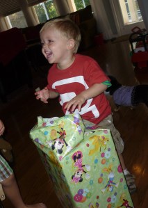 Now of course we couldn’t wait until after the cake to give him his presents…sooo… From mom and dad he got his first big boy bike, from Davy a Cars helmet, from Papa a Little Peoples Car Garage, and from Granny the Slinky dog from the movie Toy Story (it looks like Maggie).