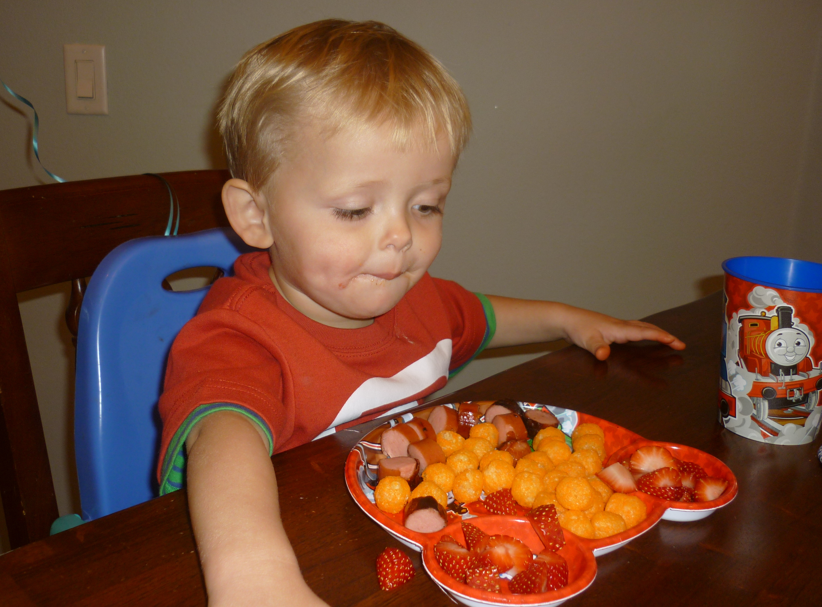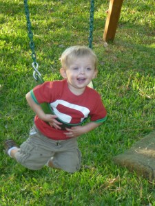 After presents were opened, Andy cooked up one of Matty’s favorite meals: grilled hot dogs, cheese puffs, chips, and strawberries. I took down the baby swing off of the swing set, and put up a lowered big boy swing just for Matty.