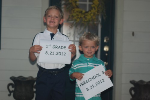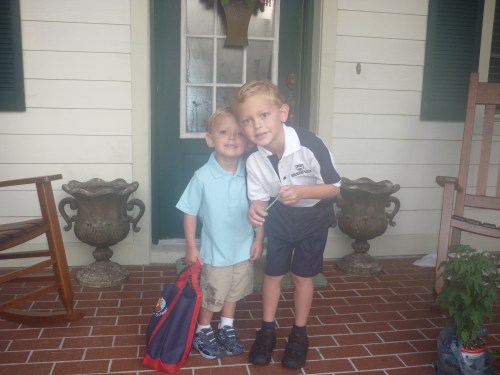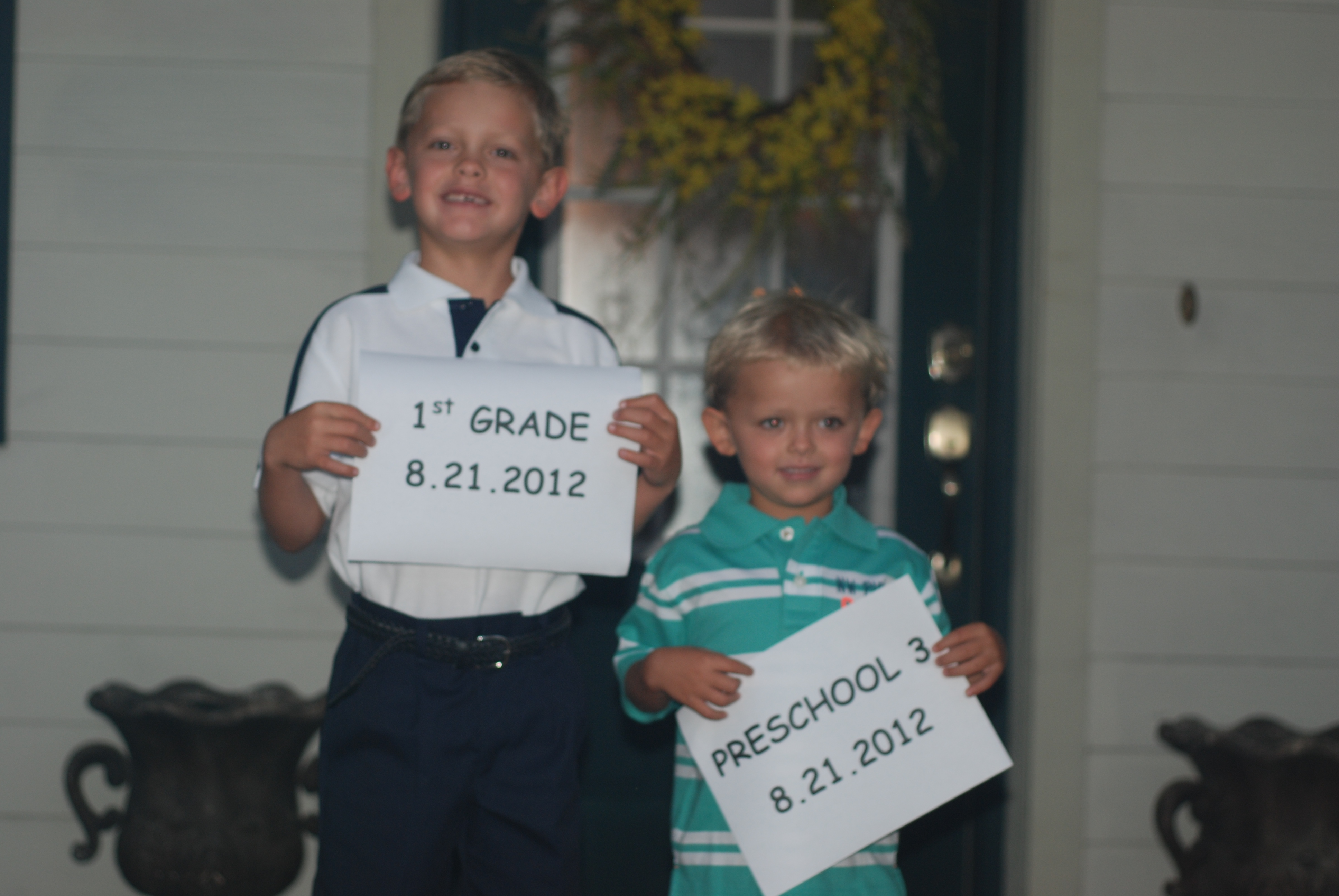 It was the first day of school and our boys were ready to go! The night before we laid out their clothes, packed their bags, and went to bed early because we all knew that 6:30am was going to be here before we knew it. Most of the summer the boys were getting up between 7-7:30, so this transition wouldn’t be too hard on them. For breakfast they gobbled down some pancakes with syrup and whipped cream and a big glass of OJ. With their bellies full, they got dressed, and we headed outside for our traditional in front of the house photo. Although I laid the camera out early hoping that the lens would adjust to the August humidity, it didn’t so a few of them are cloudy. Oh well, I’d rather have cloudy pictures instead of no pictures. 🙂