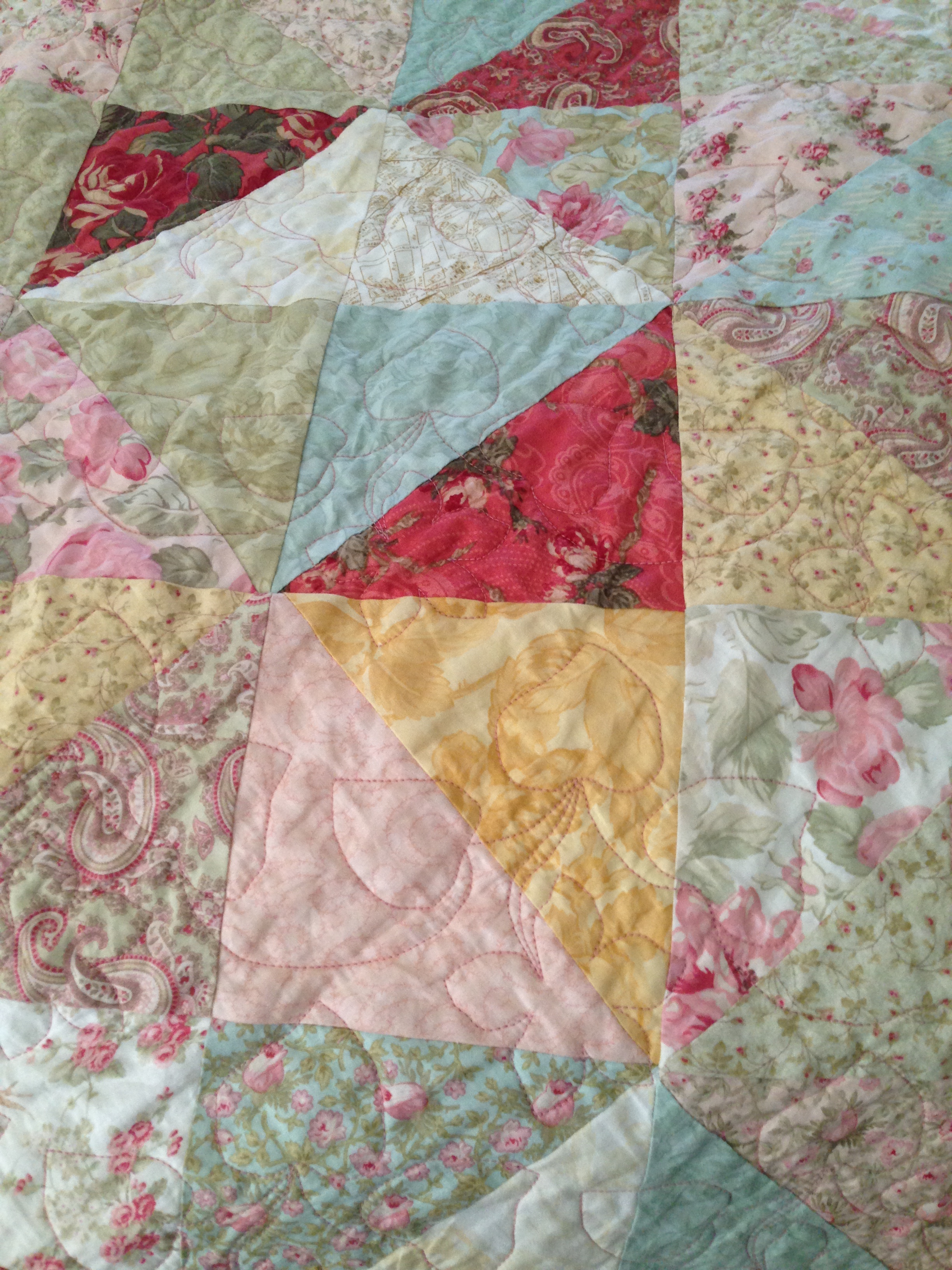 For Mom’s birthday, I told her that I would make her a quilt. I let her pick out the fabric colors, but I got to pick out the pattern. After looking at hundreds of patterns, I picked this one because I want it to remind her that I love her every time she sees it… 🙂