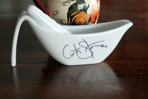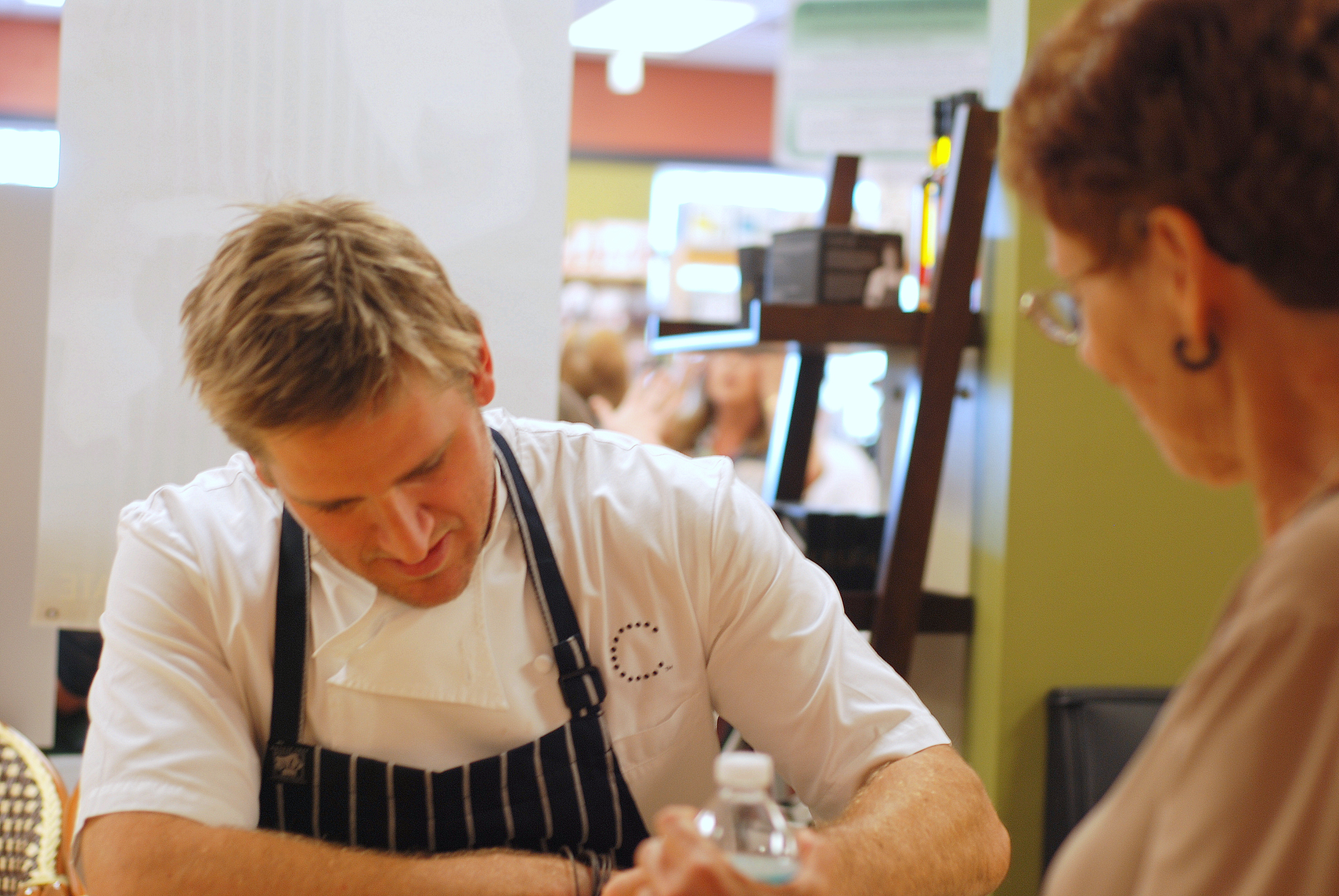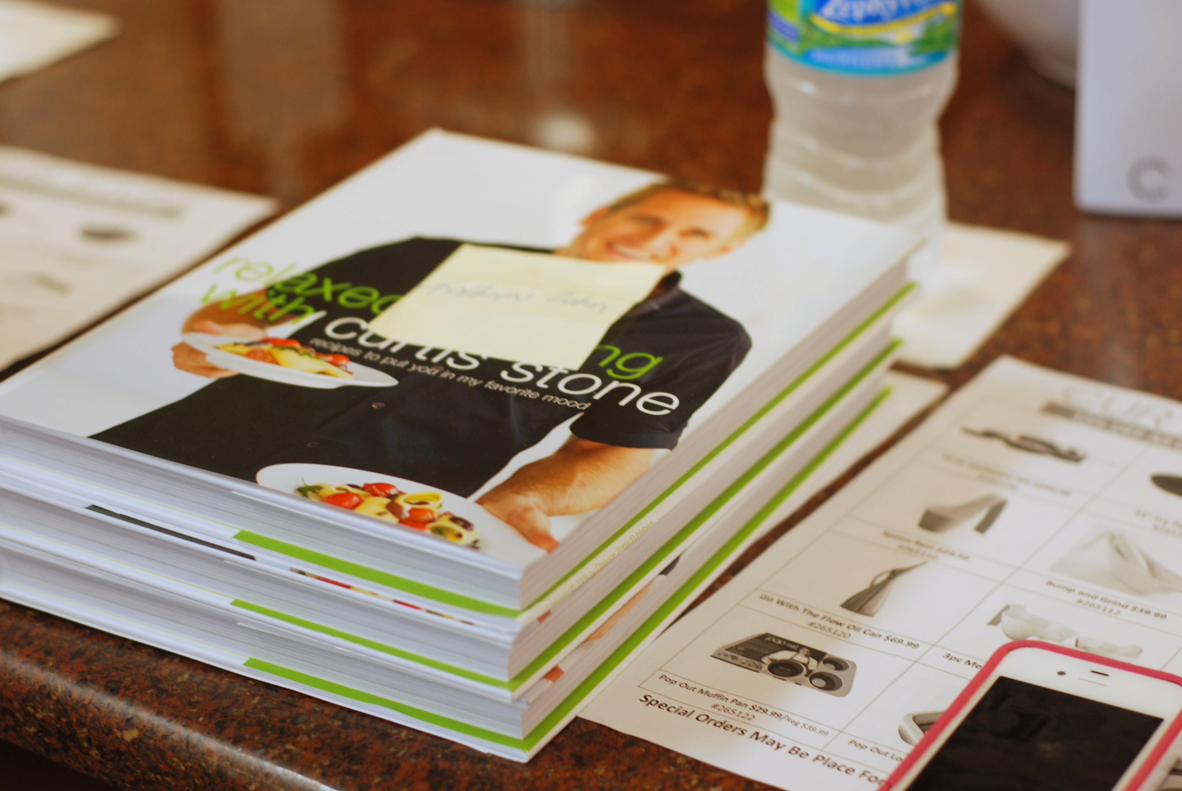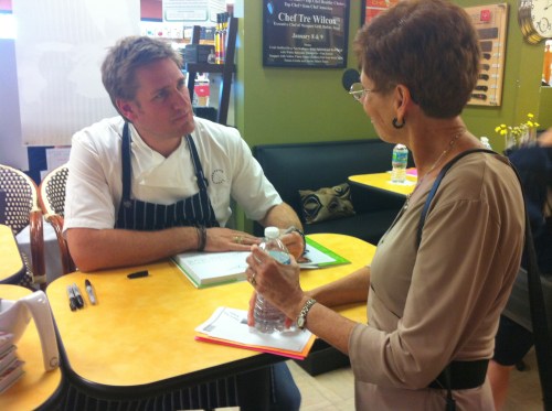 About this time, they wrapped him up and set up for the cookbook signing. A few of things that we picked up were the mixing bowl set, a woket (he says it is a cross between a wok and a skillet), and what he calls a bump and grind (a mortar and pestle) which I had signed as well. One of the neatest products that he is launching is bakeware where the bottom is made of silicone so that you can pop out your food versus scraping, lifting, and shaking. They were handing out individual baking cups just for showing up today…so fun! We had a great time, were photographed by Creative Loafing, and I still want him to come home with me to cook…. 🙂