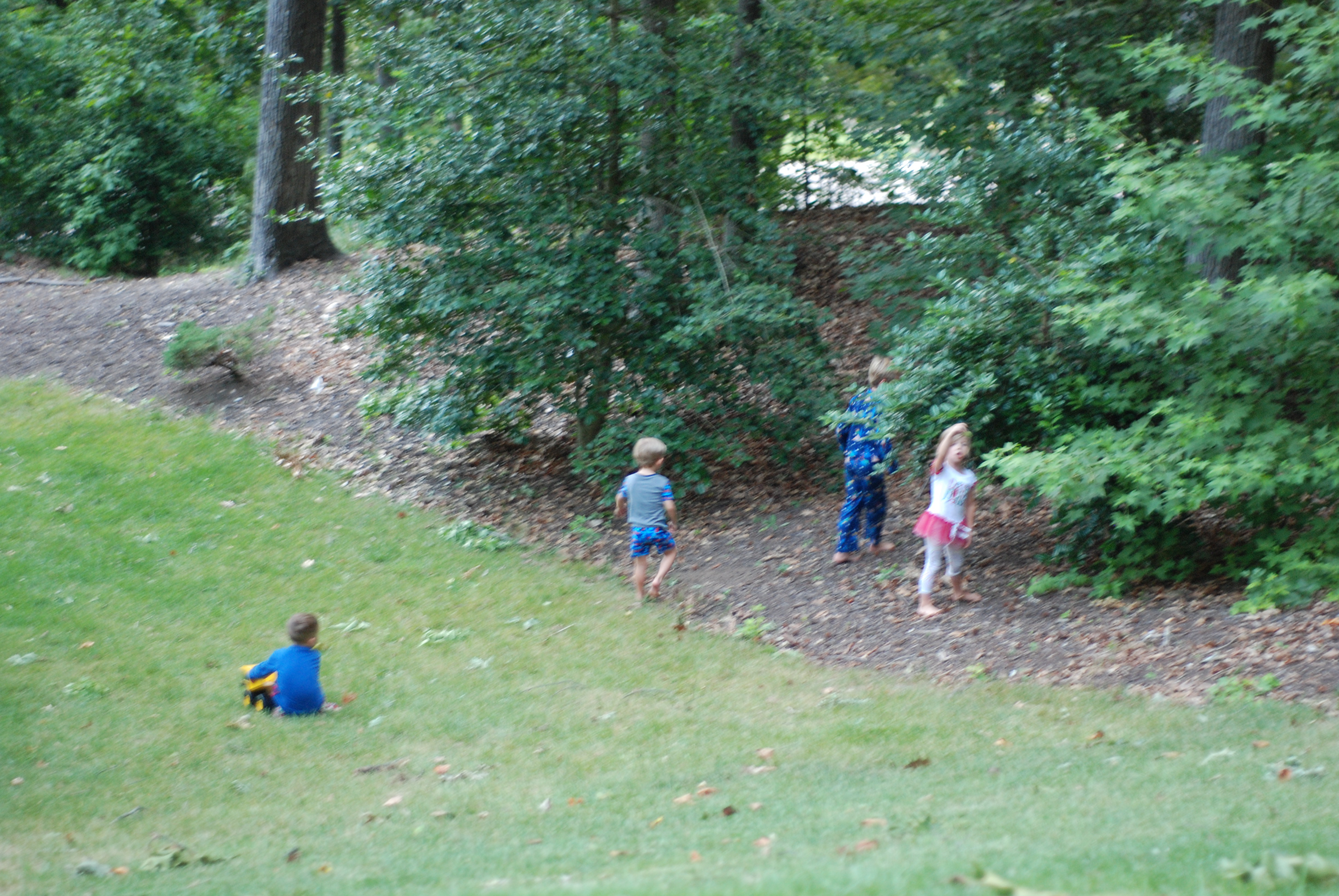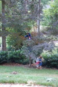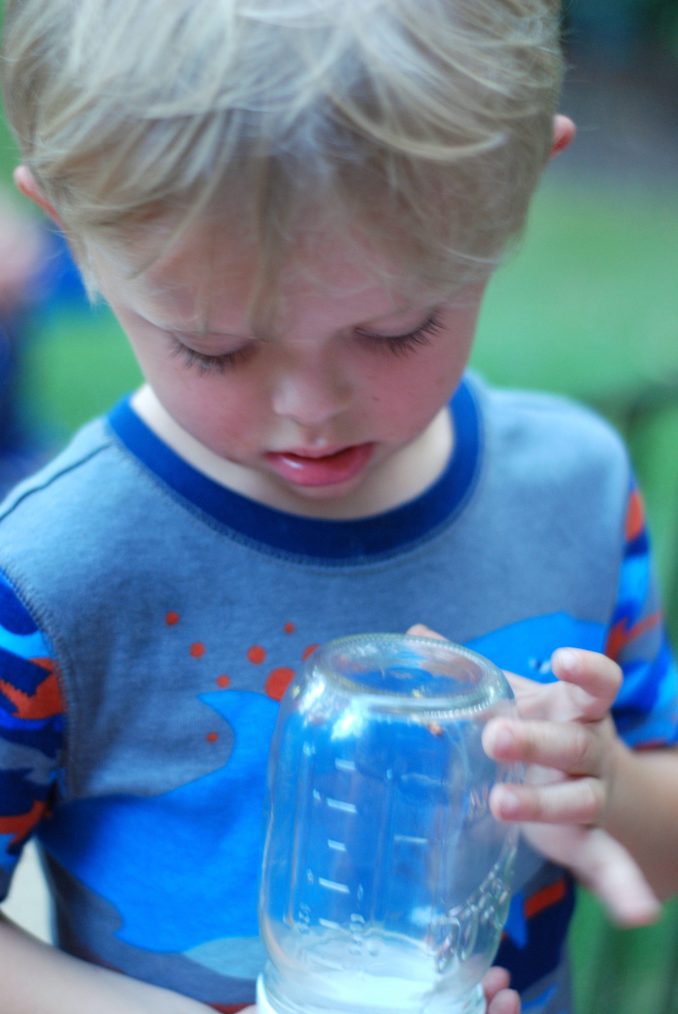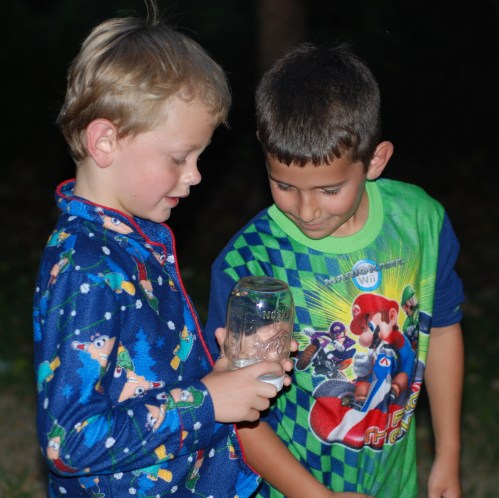 The evening thunderstorms seemed to be holding off a little bit tonight, so we set out to find the fireflies. While we were waiting for them, the boys climbed the trees and ran around with the dogs. Connor caught the most, he was super pleased. 🙂