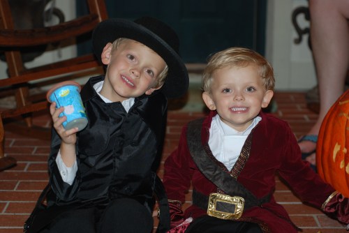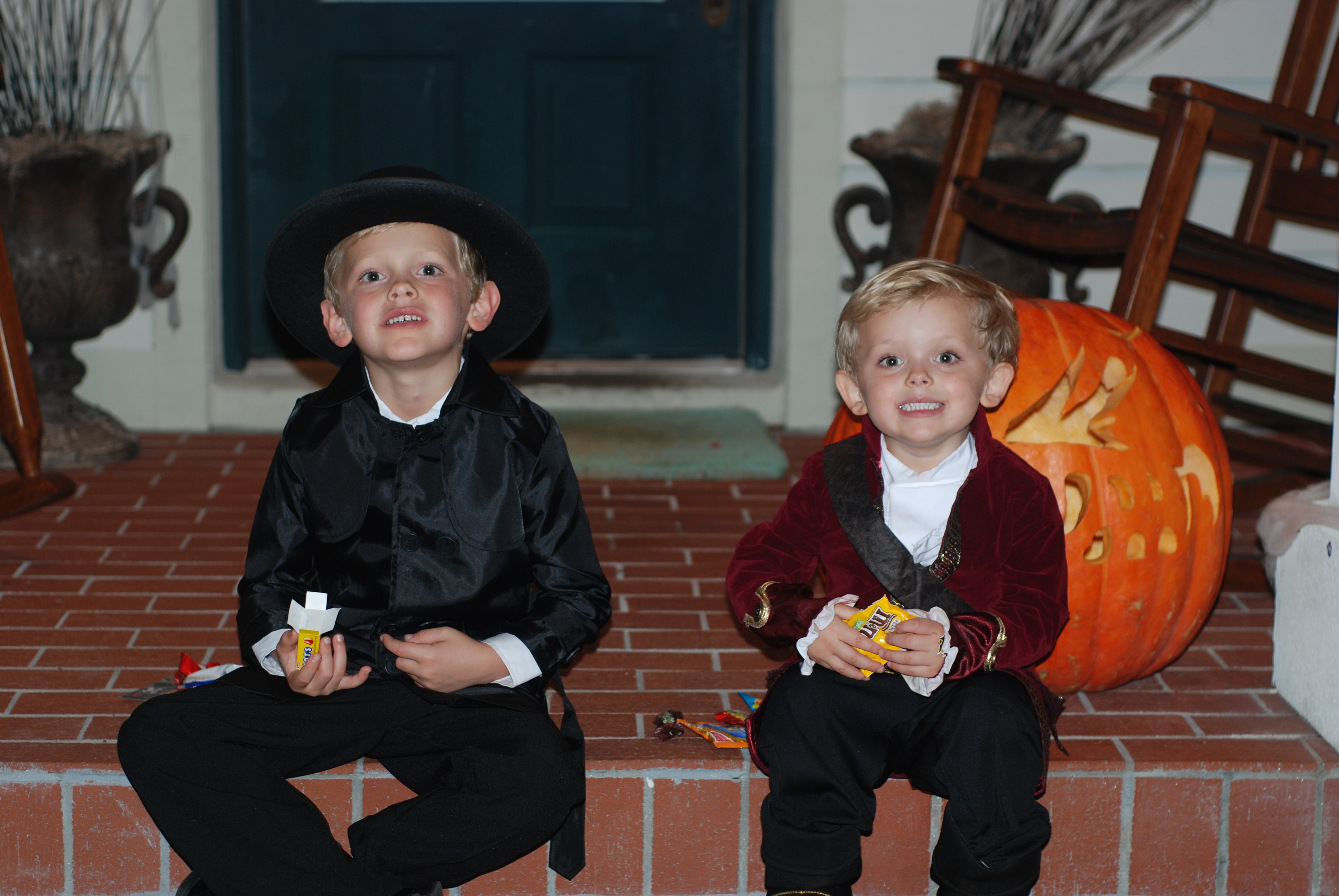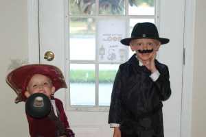 After a full day of rain and waiting, the sun finally came out and the children excitedly got dressed…it was time to go Trick-or-Treating!!! Since Friday a few things have been lost along the way: Matty’s hook, Davy’s sunglasses and tie. They didn’t care though, at this point it was all about the candy. At about 5:30 Colin and Connor came over and we knew then that not many were going to make it to six. I was lucky to get a few photos before they ran out the door. Once again, here is my OSS Super Agent Kid Spy and Captain “Matty” Hook!